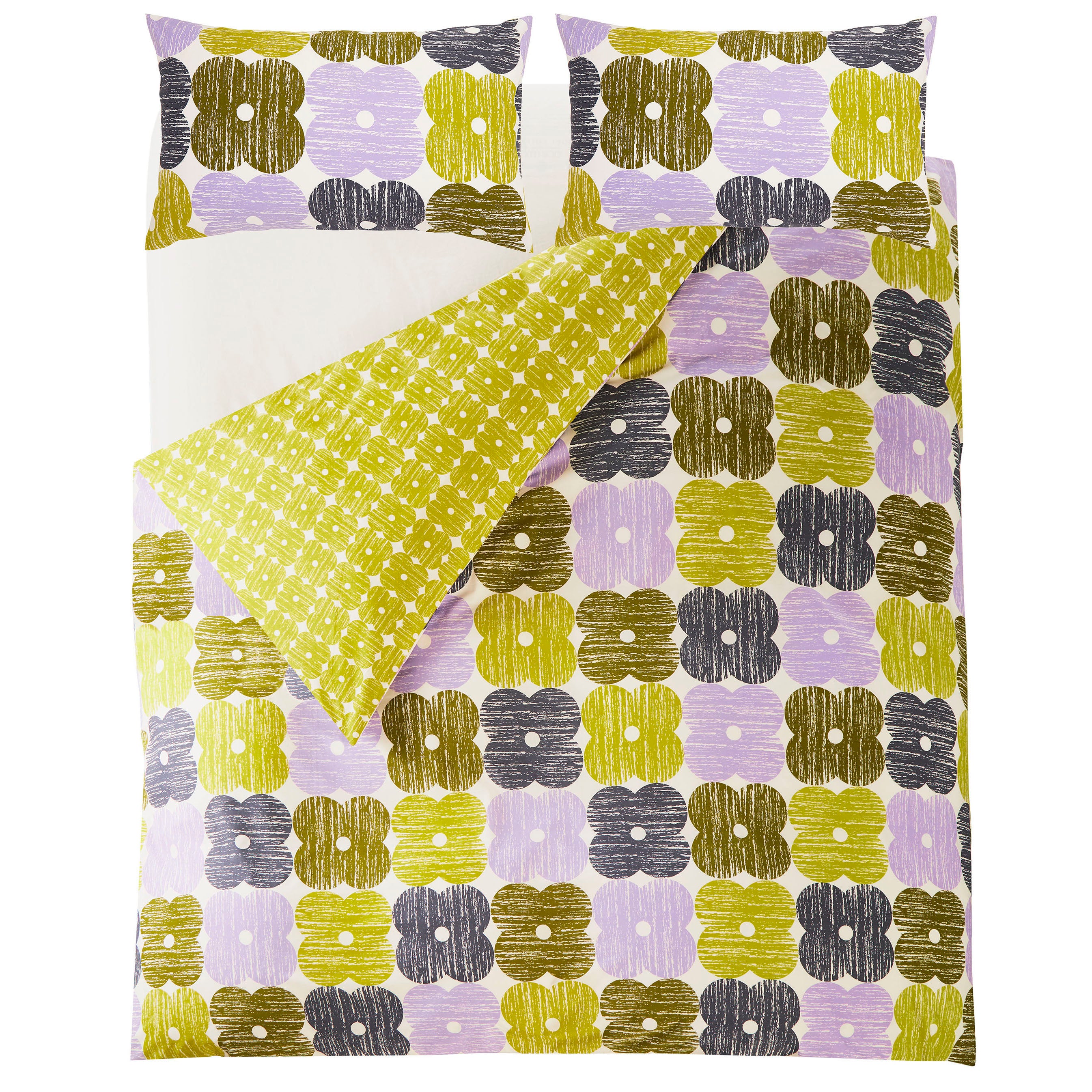 Experience a touch of the 70s with this Orla Kiely Textured Flower Duvet Cover Bedding Set in Lilac Moss. Its intricate four petal flower pattern and distinct bark texture add character to any bedroom. With a 200-thread count cotton percale base, this bed set offers both style and quality. Available in neutral tones of light cream, lilac, and seagrass green, it complements any decor.