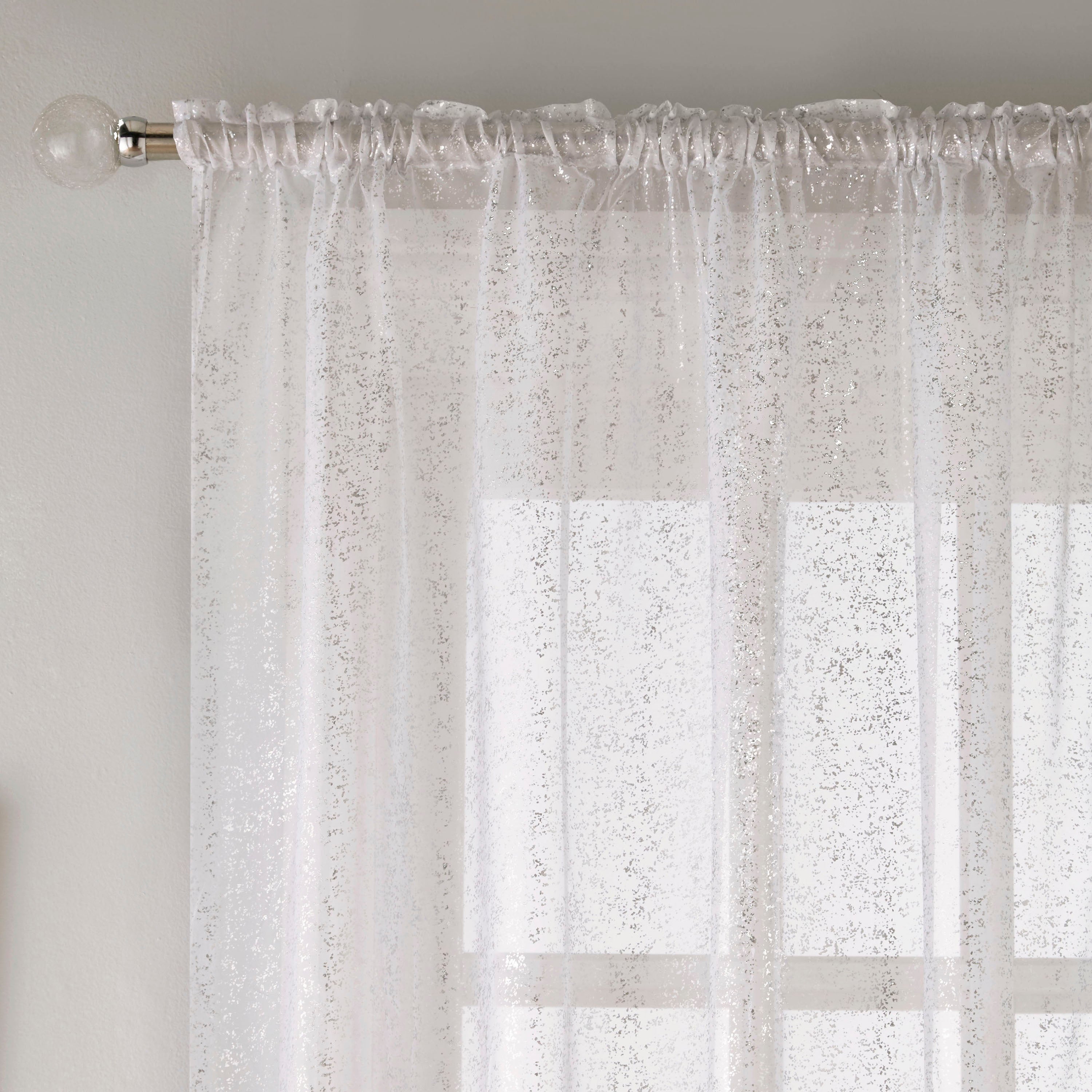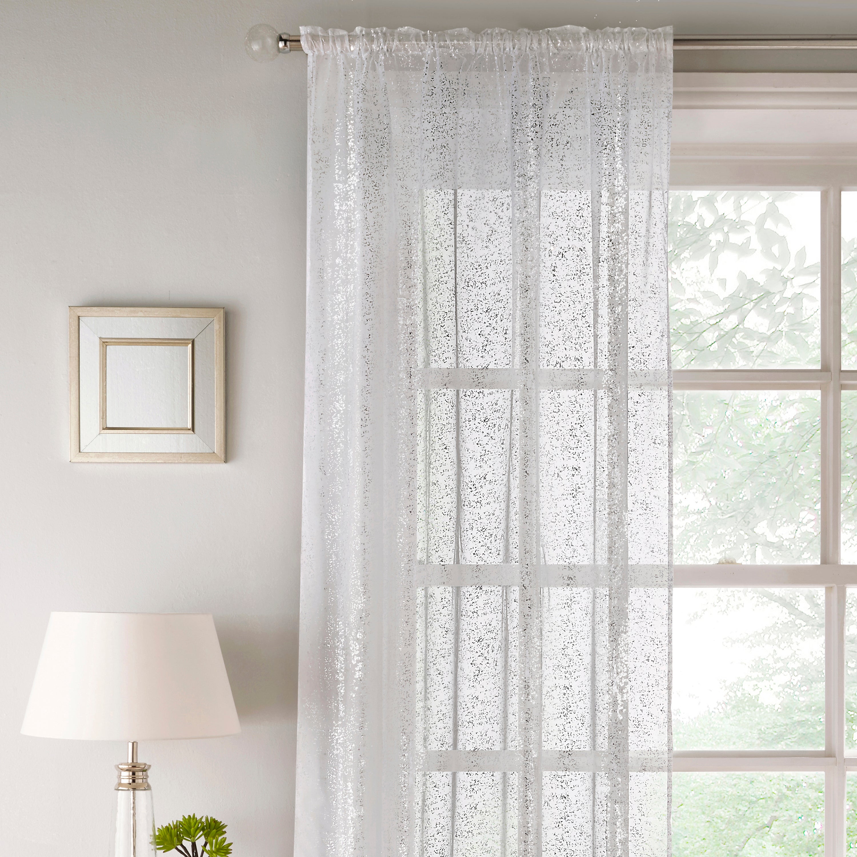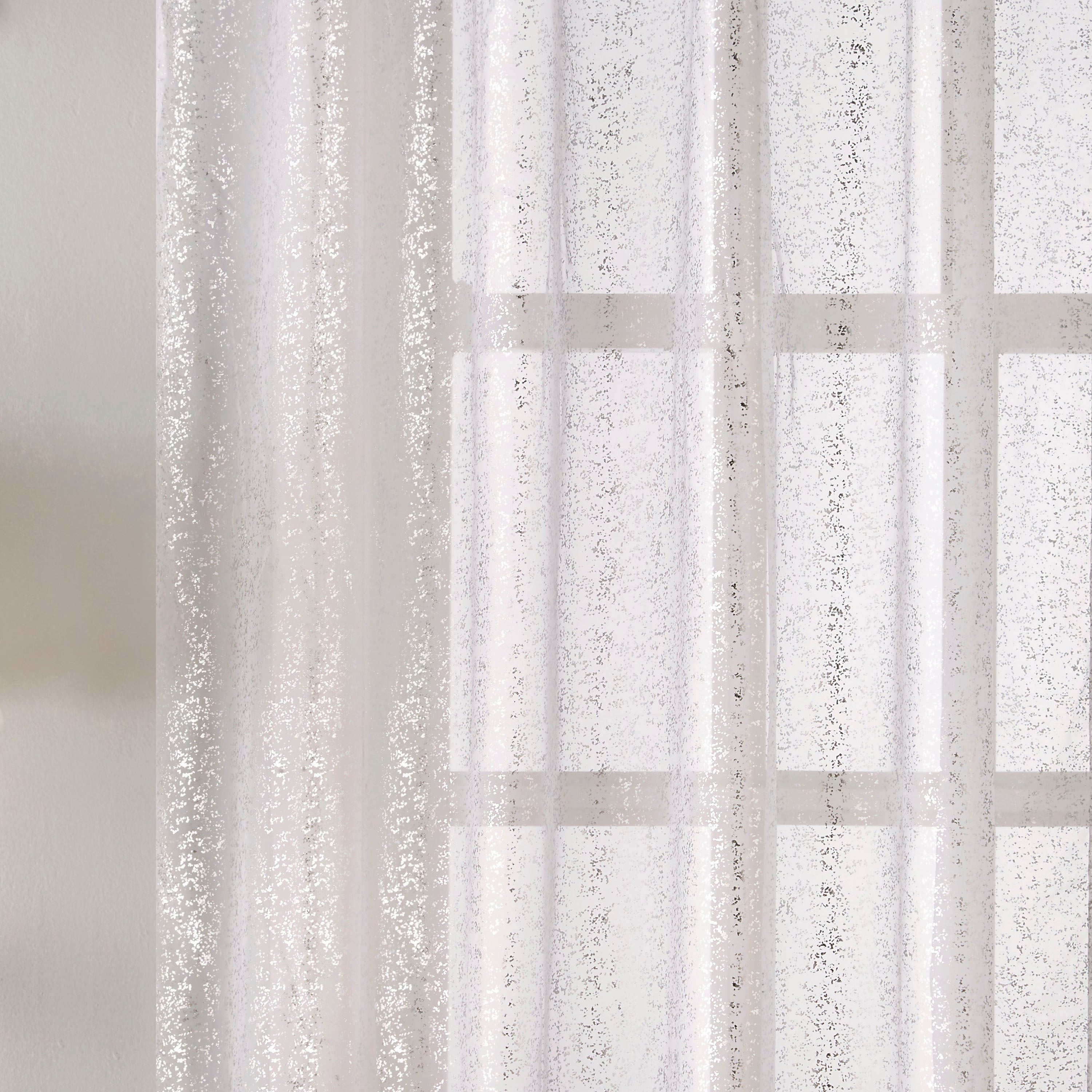 The Pandora voile panel's all-over metallic silver design brings glitz and sparkle to your house.