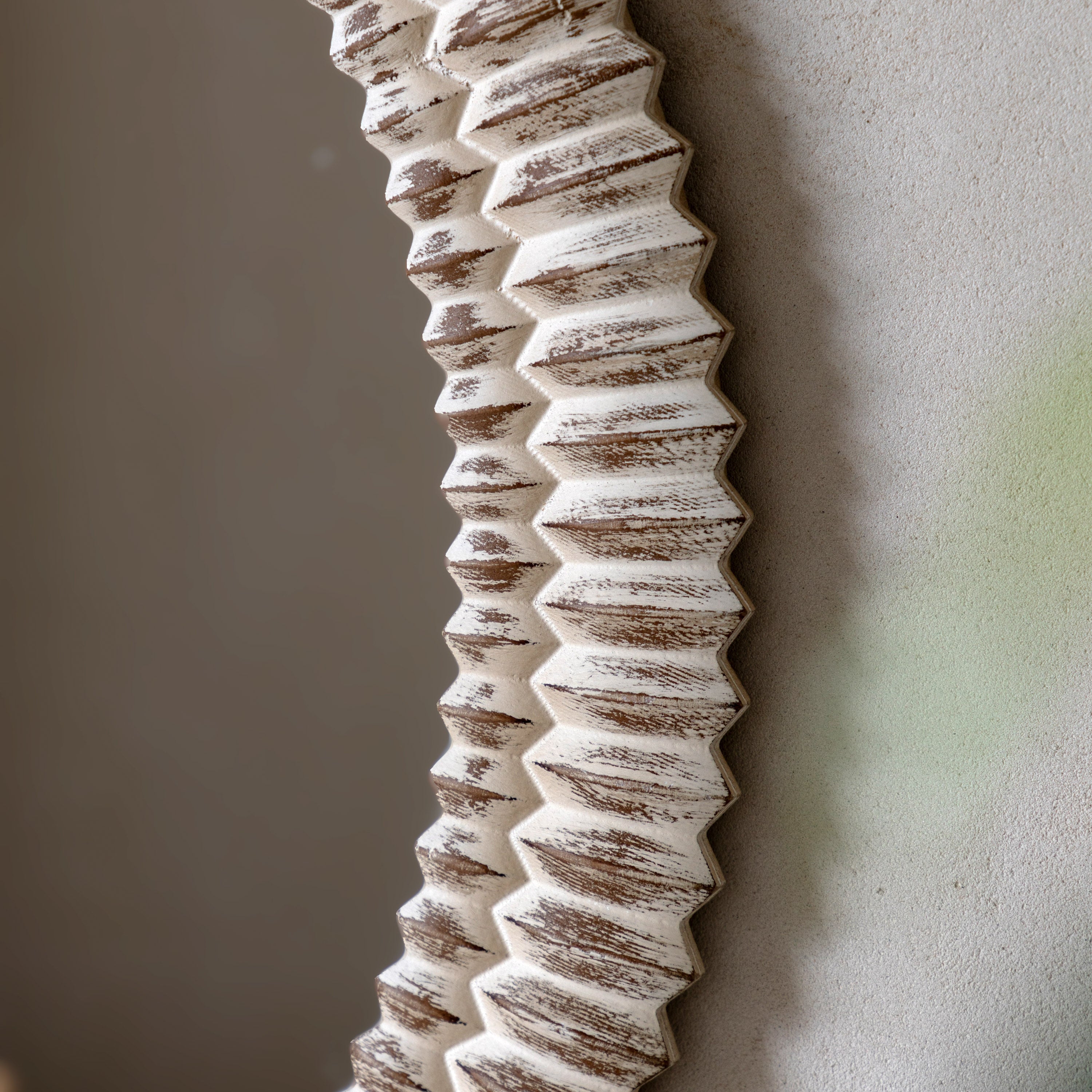 Add elegance to your home with our round mirror featuring a unique 3D wooden etching-style frame and a chic whitewash finish. The intricate etching adds texture and character, while the whitewash treatment brings a soft touch of coastal charm to the natural wood. Perfect for any room in the house, this versatile mirror measures 90cm x 90cm and adds a timeless, sophisticated grace to your living space.
