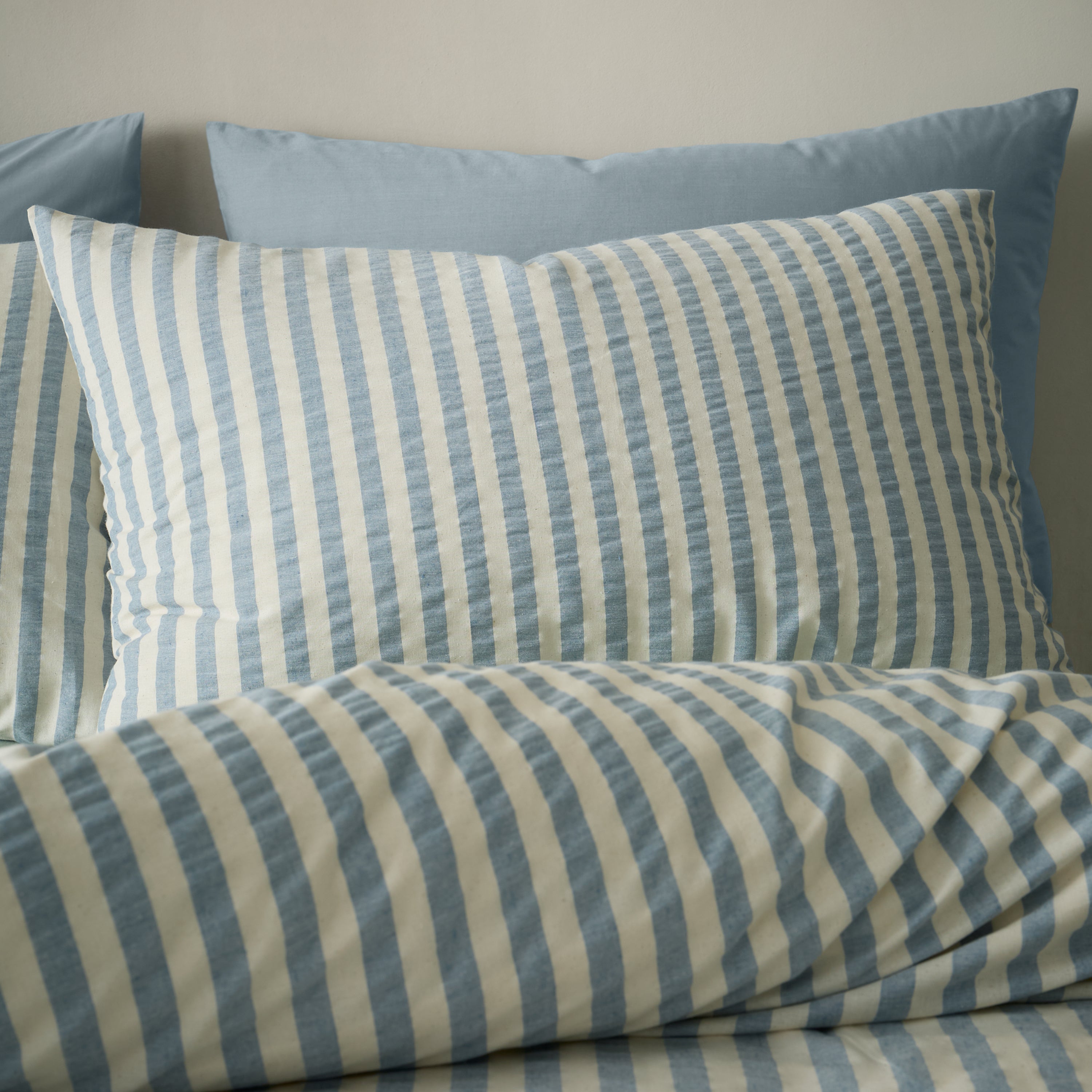 Elevate your bedroom with this premium cotton-rich duvet cover set, featuring elegantly woven stripes in tranquil blue hues that evoke understated sophistication. Rooted in international artisan heritage yet interpreted for modern living, the design integrates seamlessly into varied décor styles whilst maintaining distinctive character. Every element reflects rigorous quality standards and environmental responsibility, with STANDARD 100 by OEKO-TEX® certification guaranteeing material safety and ecological integrity. The luxuriously soft surface provides daily comfort, whilst the carefully considered stripe detailing introduces subtle visual interest and tactile dimension to your sleeping space.