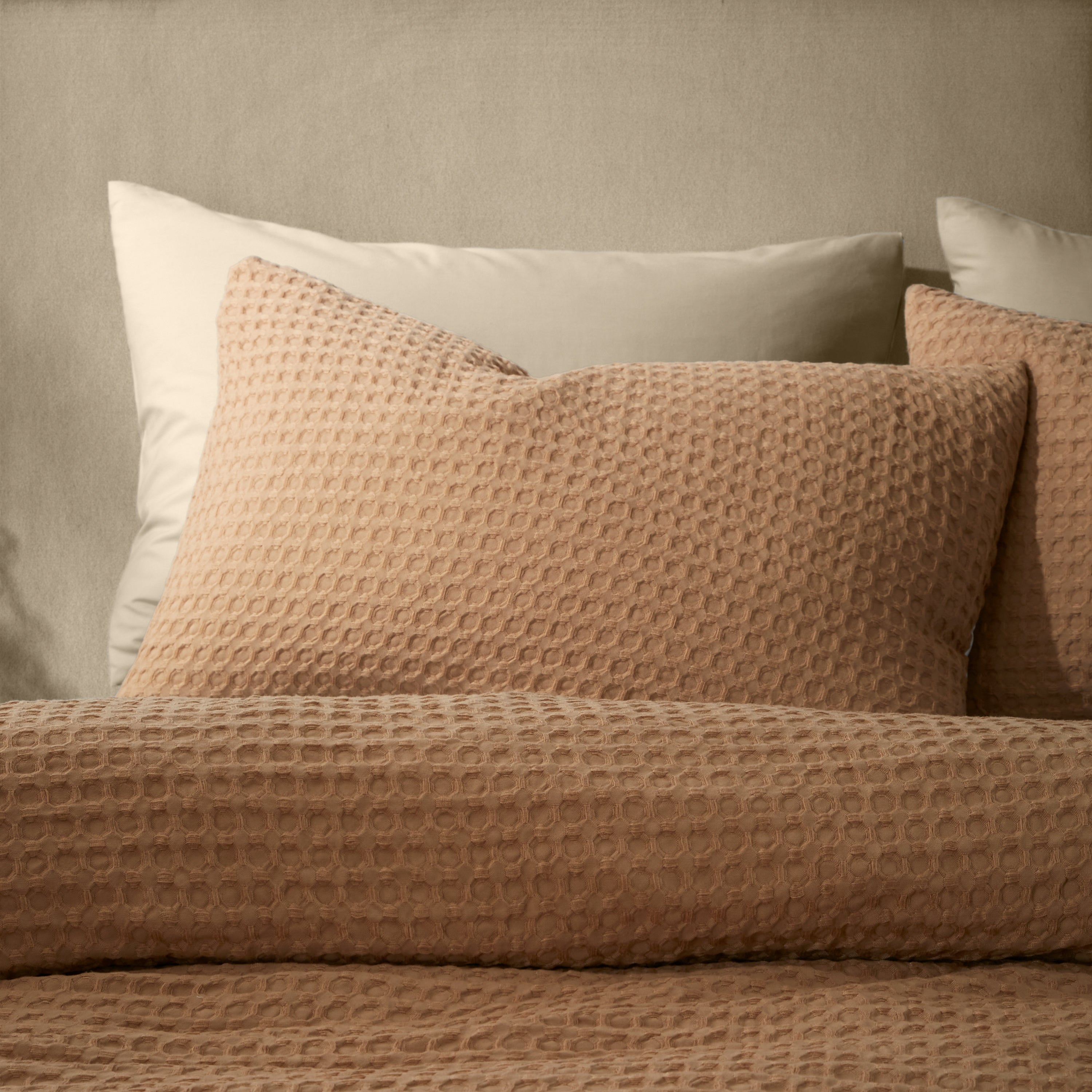 Experience a luxurious blend of texture and warm tones with the Pineapple Elephant Muscat Waffle Duvet Cover Bedding Set Caramel. The soft waffle weave provides a cosy and relaxed atmosphere, ideal for adding depth and comfort to any bedroom. This exquisite collection features a fusion of global influences, presenting a modern take on artisan patterns and classic textures.