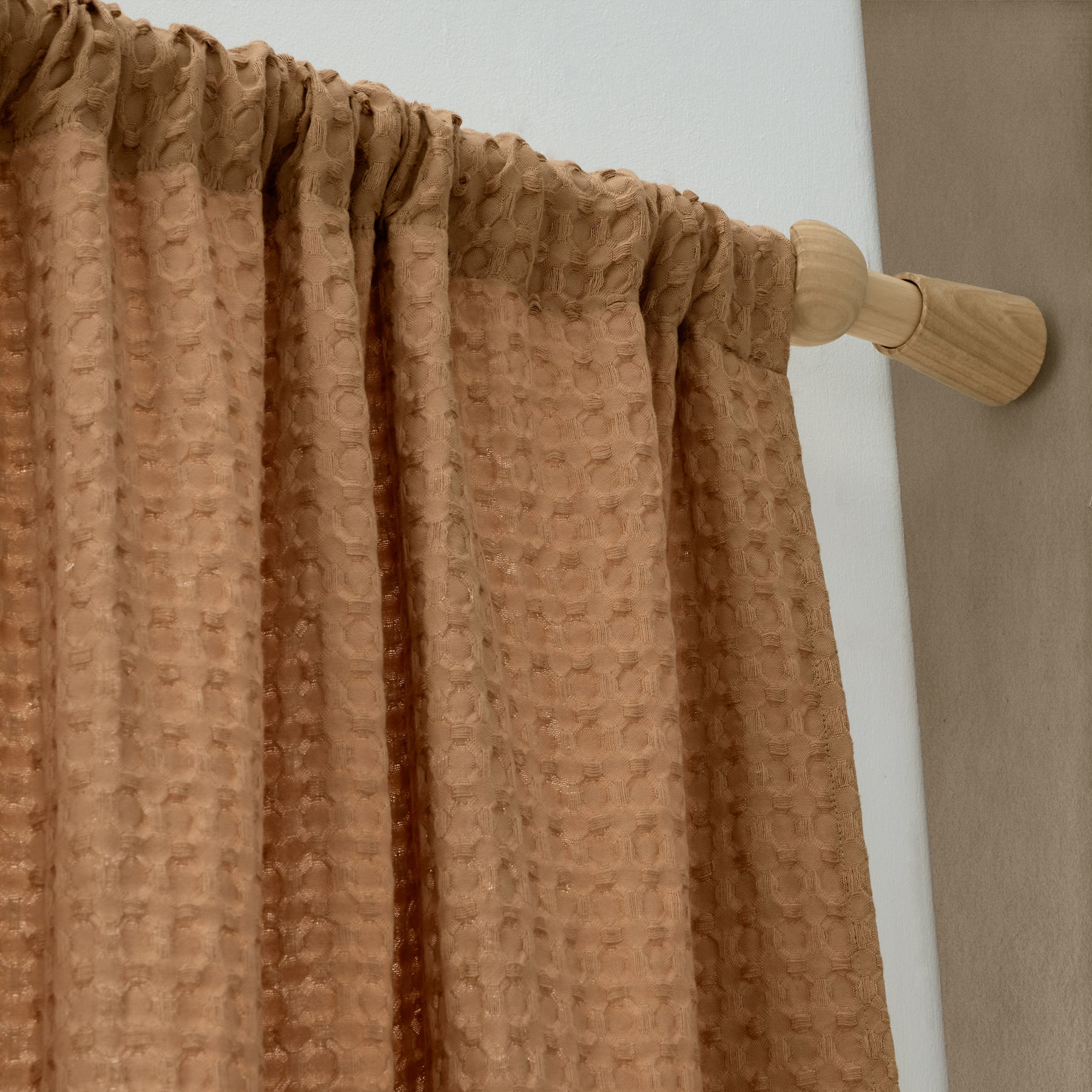 Experience the rich texture and natural hues of this waffle voile curtain. The woven texture adds a touch of effortless style, while the slot-top header and lightweight fabric allow for both light and privacy. The collection features a mix of global influences and artisan motifs, with a modern twist on timeless textures.