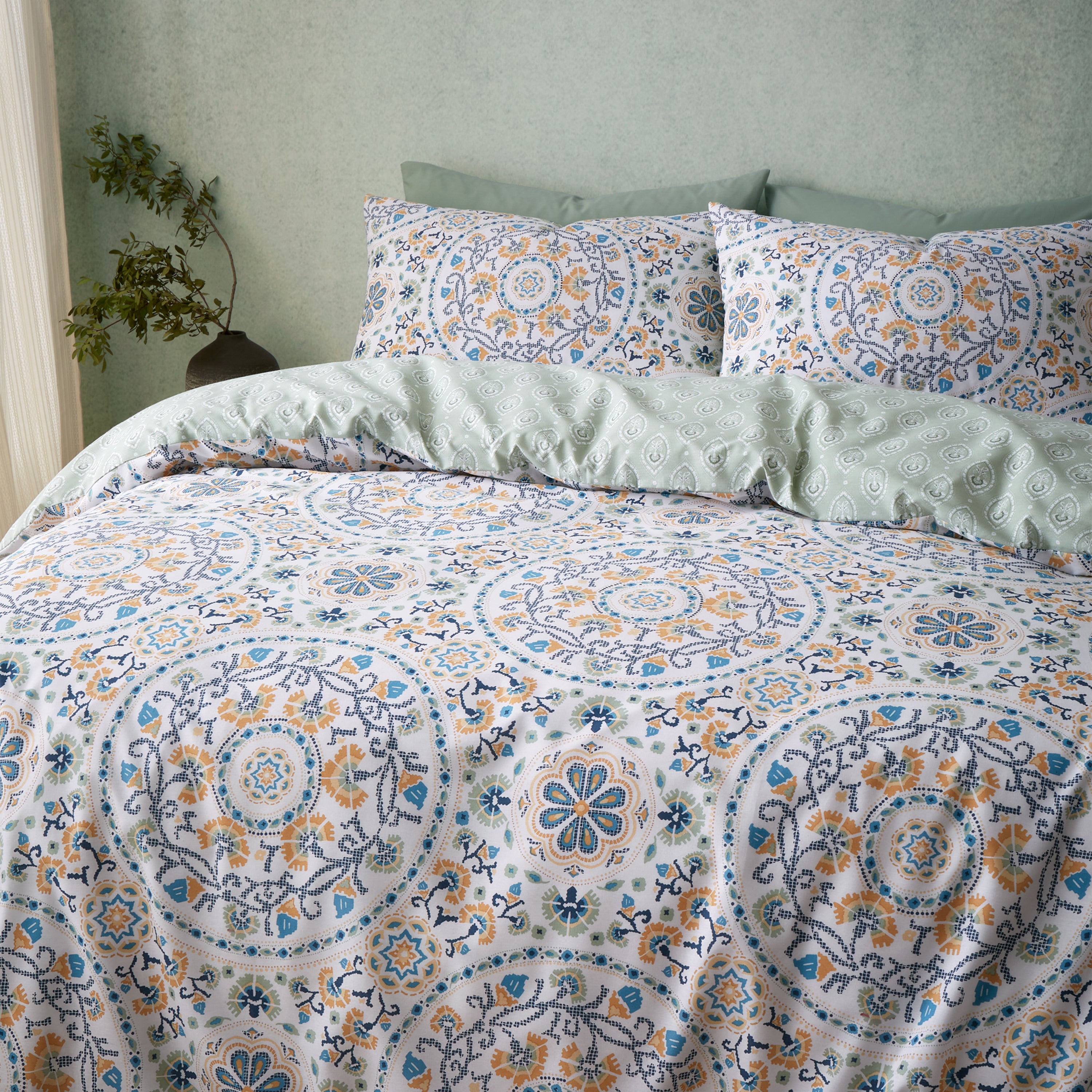 Derived from its African origins, this mandala design features traditional techniques of repetitive circular shapes arranged in a floral layout. By combining hues of blue and desert gold with a smaller sage green reverse, it creates a cohesive, globally-influenced appearance. Crafted with eco-friendly materials such as sustainably sourced cotton for a luxurious texture and recycled polyester for convenience and environmental awareness.