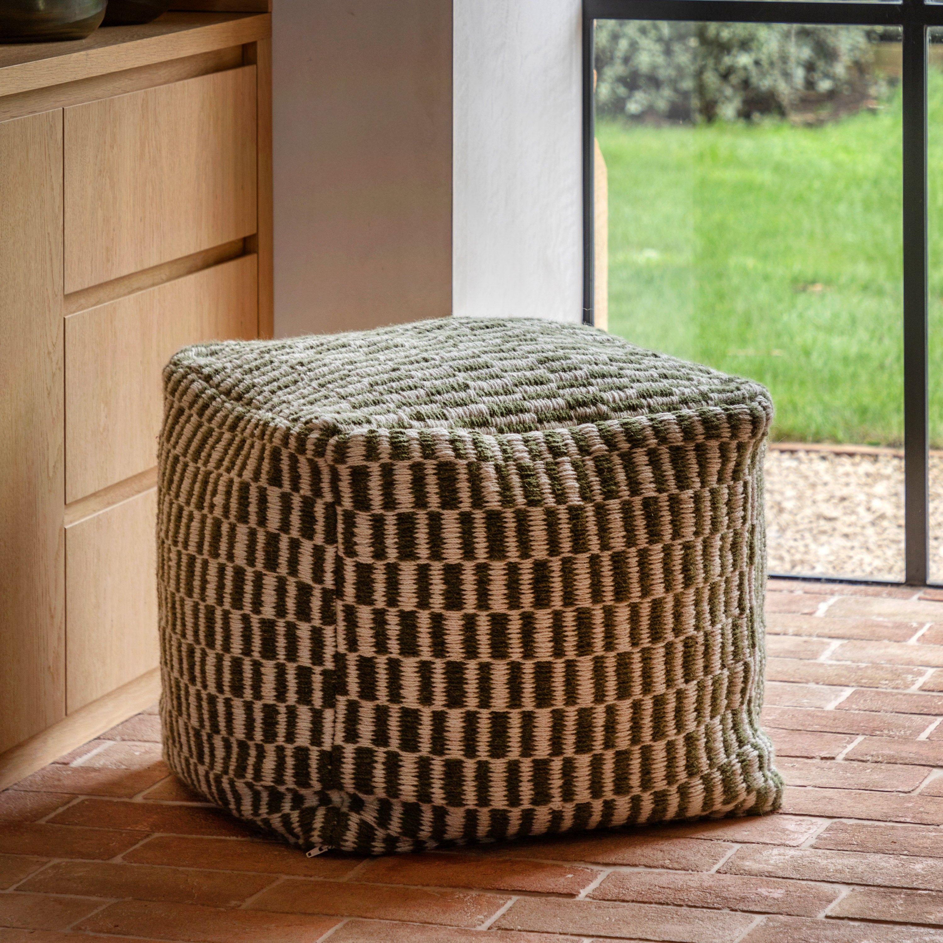 Constructed with durability and versatility in mind, this pouffe boasts a timeless olive green check design that adds modern flair to any living space. Its sturdy woven fabric ensures long-lasting use as a footrest or as additional seating for guests, providing both style and practicality in equal measure. Sized at (w) 500 mm x (d) 500 mm x (h) 450 mm, this pouffe is the perfect addition to complete your living room décor.