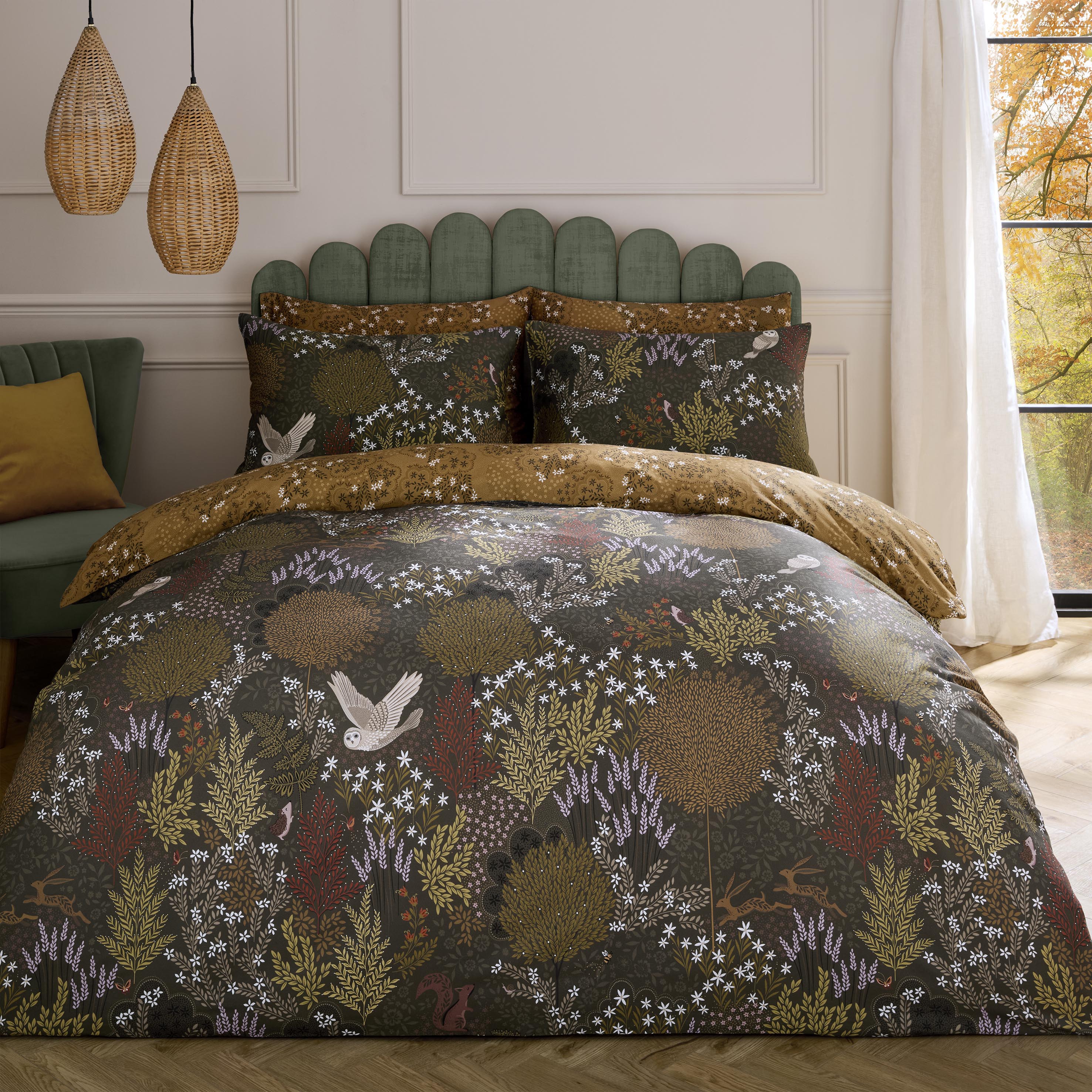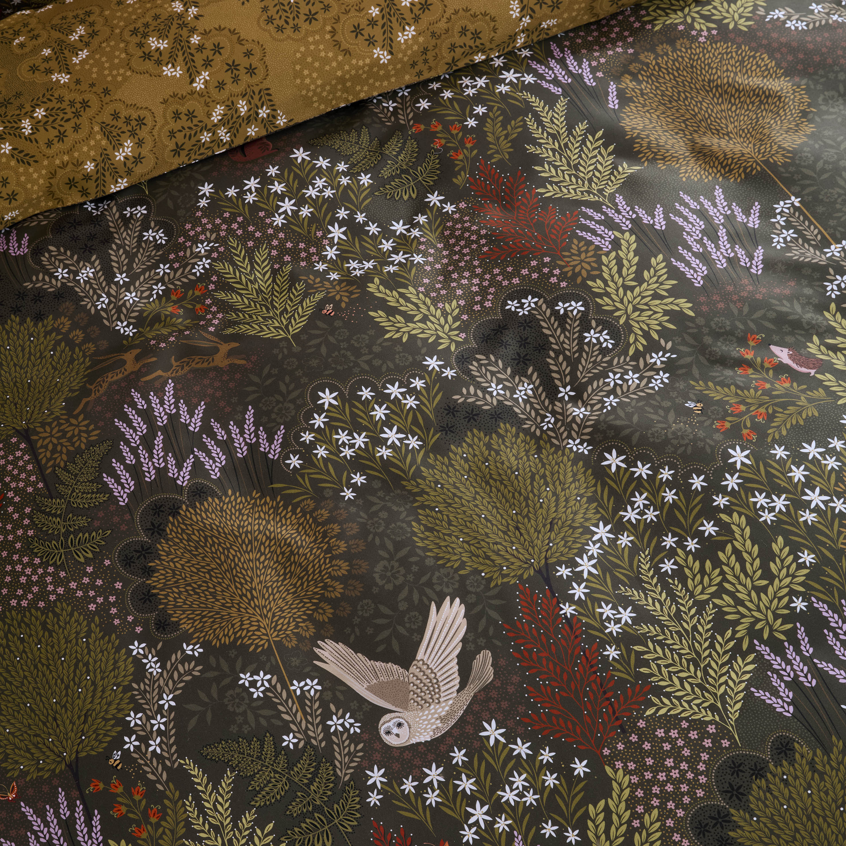 Create a tranquil woodland retreat in your bedroom with the Sara Miller Owl Forest Reversible Bedding Set. One side showcases a deep olive green canvas embellished with woodland creatures among trees and heather, while the reverse features warm yellow ochre tones accented by delicate white blossoms. Made from 220 thread count 100% cotton sateen, this set offers exceptional softness, breathability, and a smooth finish. Its rich natural hues and intricate design make it ideal for nature enthusiasts and those seeking a touch of magic at bedtime. Available in single, double, king, and super king sizes, each set includes a duvet cover and pillowcases (single includes one pillowcase).