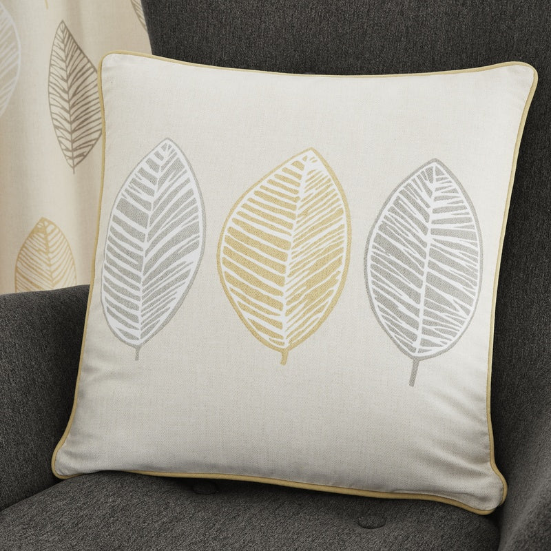 The Skandi Leaf filled cushion has a composition of 100% cotton and features a printed pattern of three leaf motifs running across its centre. This pattern is enhanced with a coloured piped edging.