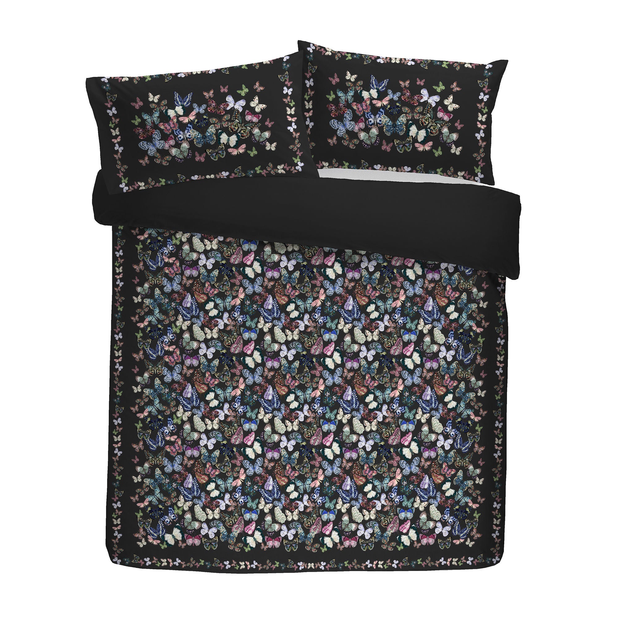 Experience the elegance of the Papillon duvet set, featuring vivid butterfly motifs on a velvet panel print with refined border accents. The reverse side is crafted from smooth, plain-dyed polyester. This set transforms your bedroom into a sanctuary of sophistication, inviting restful and luxurious sleep.