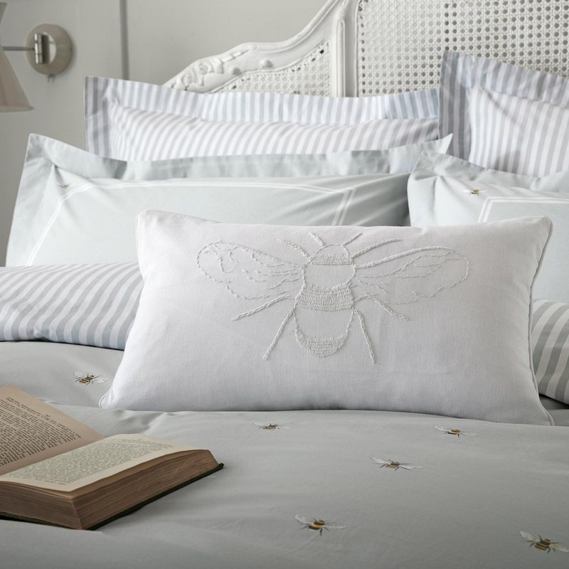 The Sophie Allport bedding range features a number of whimsical designs combined with tonal sophisticated shades perfect for adding a calming air to your bedroom choice which also has personality. This lovely design features stylish bee motifs on a soft duckegg background. This contemporary design was inspired by the buzzing bees around Sophie’s country garden and make up the face of this doubled sided duvet cover, the reverse features a pinstripe design adding a classic contrast. This 200 thread count cotton bedding collection will add a touch of the English countryside to your decor. Complete the look with the Bees feather filled cushion and throw.
