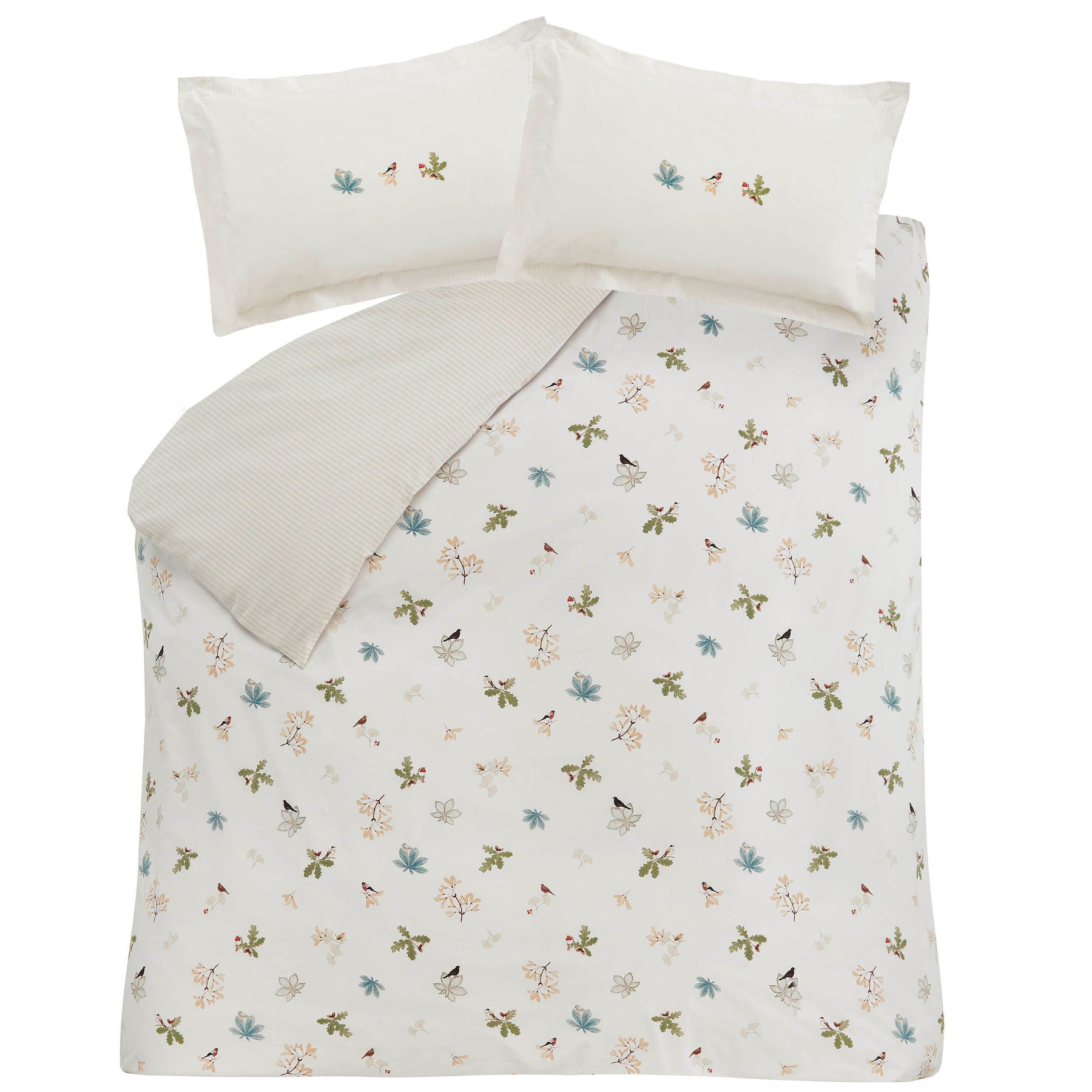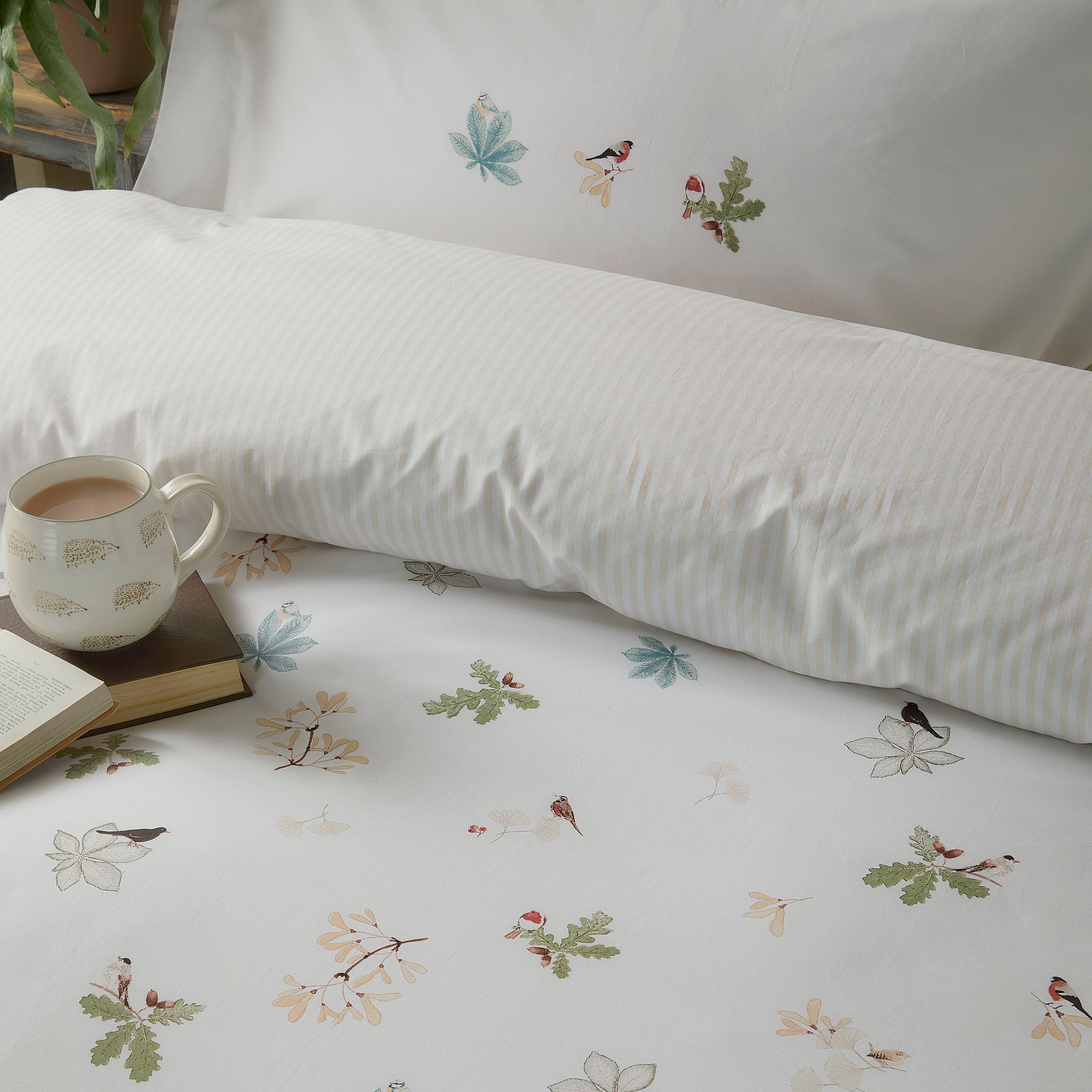 Experience restful nights with the Orchard Birds Bedding Set, inspired by the serene British countryside. Featuring finely detailed illustrations of songbirds such as blue tits, bullfinches, blackbirds, wrens, and chaffinches among oak leaves, sycamore seeds, horse chestnut branches, acorns, and berries, this design captures the essence of an autumn orchard. Printed on a crisp white background, Sophie Allport's hand-drawn artwork adds warmth and calm to any bedroom. Made from 100% cotton percale with a 200 thread count, this bedding offers breathable comfort. The reverse side presents a classic stripe for a refined look. Available in single, double, king, and super king sizes, each set contains a duvet cover and pillowcases (one pillowcase for single sets). Pillowcases can also be purchased separately in pairs.