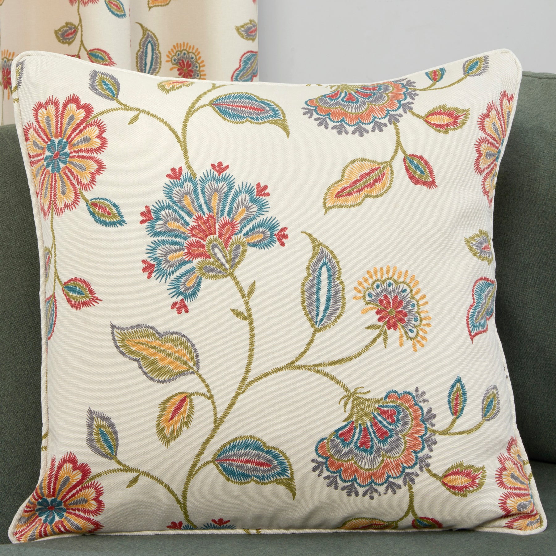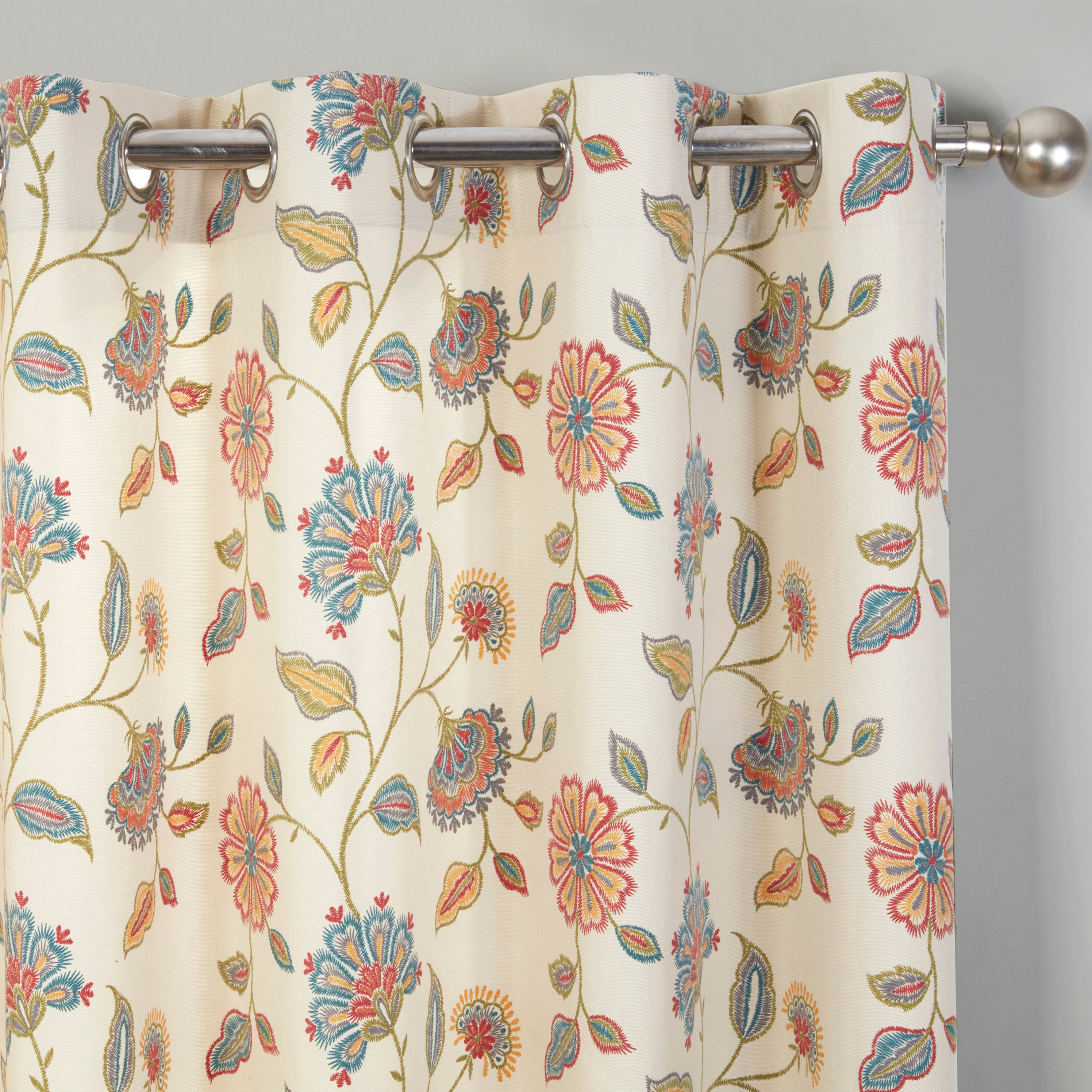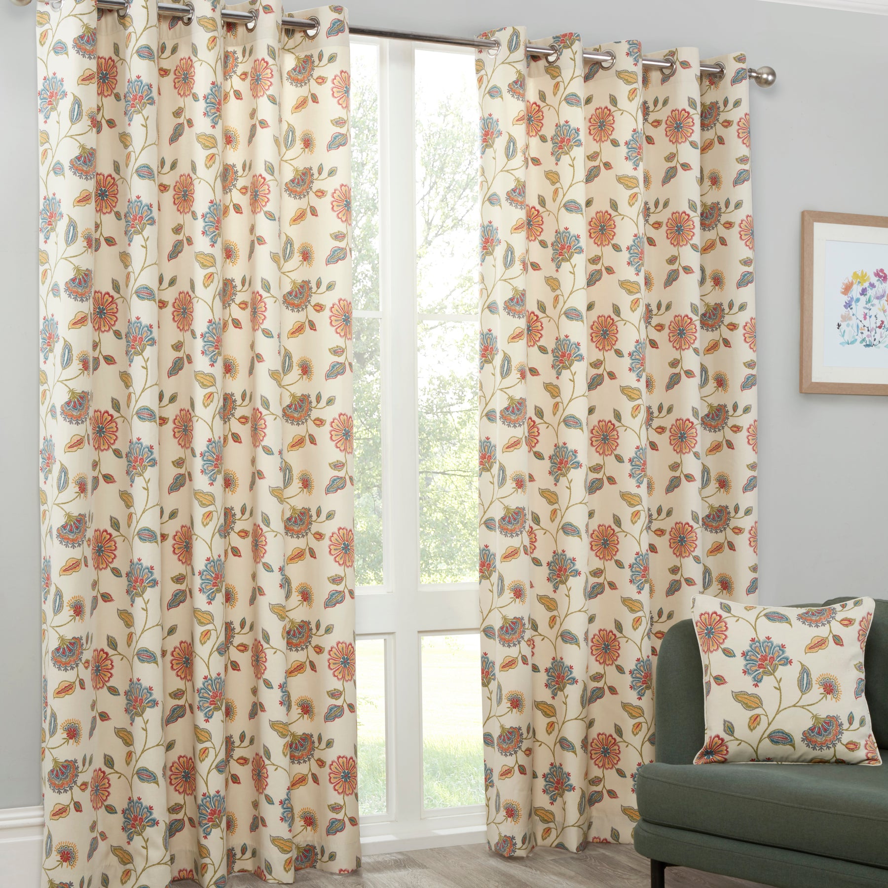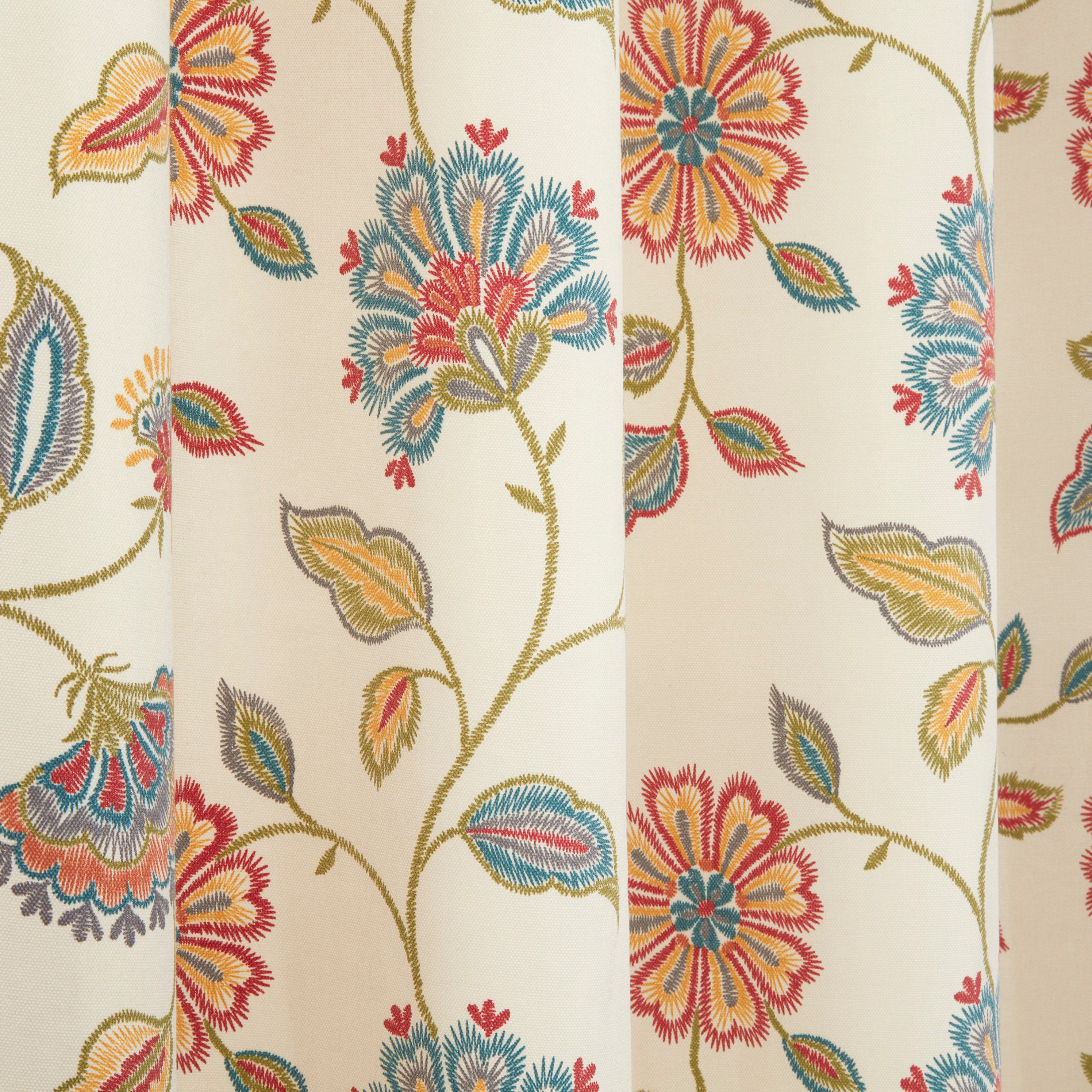 Discover Shelley, the newest addition to Sundour's renowned selection of curtains. Our printed cotton fabric boasts unrivalled creativity and vibrant colours, backed by exceptional craftsmanship and a prestigious reputation. With Shelley, we elevate embroidery to a whole new level, using a beautiful stitch pattern to emulate the look of hand-sewn art. Against an elegant ivory background, the opulent shades of red, blue, and green exude a sense of refinement. Plus, the eye-catching eyelet header adds a modern touch to this magnificent masterpiece, complete with matching cushion covers for a cohesive and luxurious appearance.