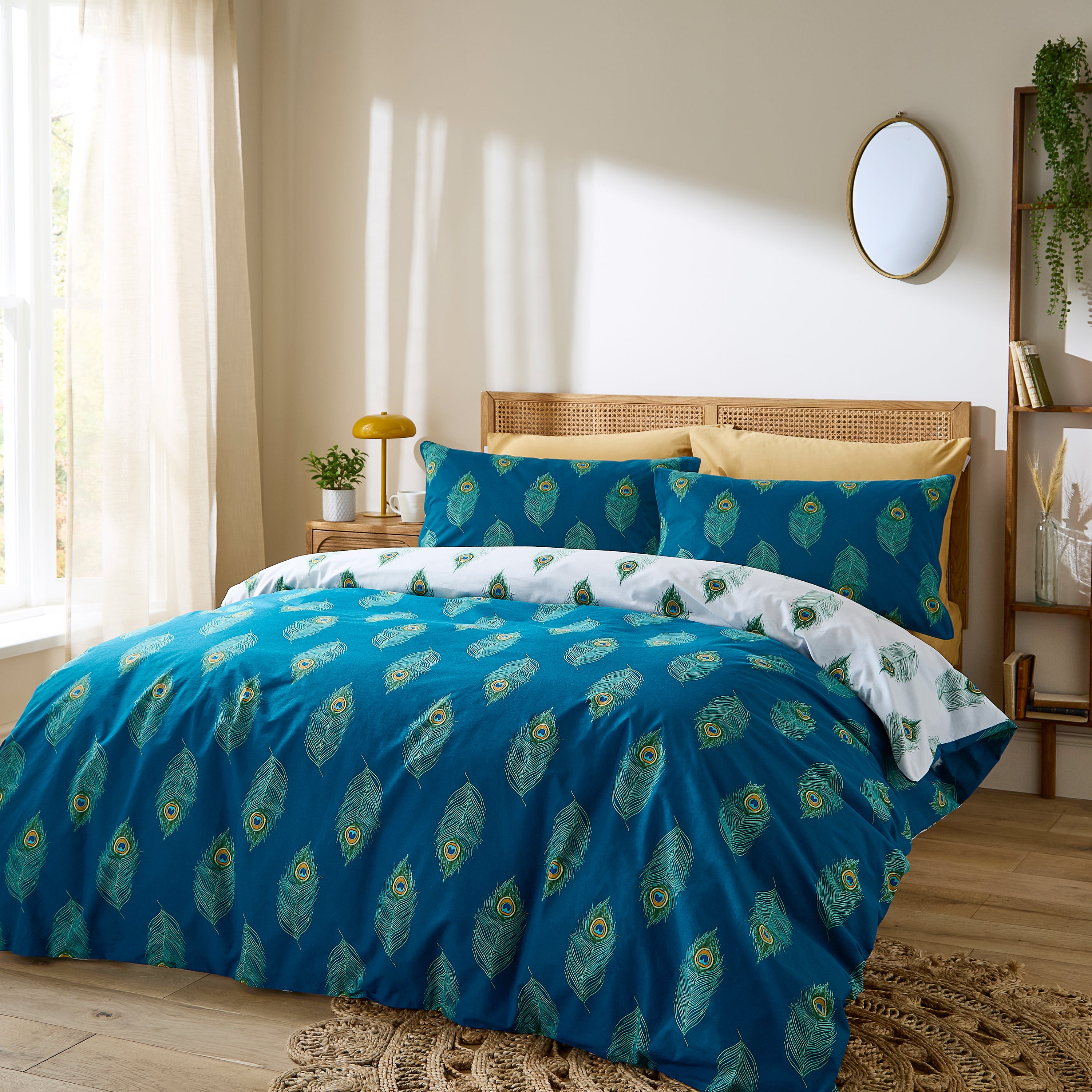 Experience refined luxury with this peacock feather bedding set, thoughtfully designed to add enduring sophistication to your bedroom. The deep teal front showcases detailed feather patterns for a lavish appeal, while the crisp white reverse with subtle feather accents provides a clean, adaptable style. Made from 100% cotton, this set offers exceptional softness, breathability, and skin-friendly comfort to ensure you sleep cool and restfully throughout the night.