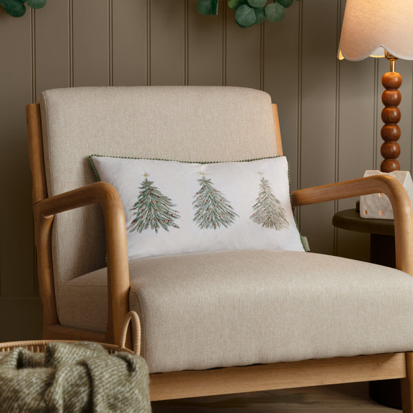 Enhance your holiday décor with the Twinkling Tree Trio Cushion, showcasing expert craftsmanship. This rectangular cushion features three finely embroidered Christmas trees set against a lush velvet background, offering classic elegance. The delicate ric rac edging adds a subtle refinement, while the plush velvet back provides a sumptuous feel. Ideal for introducing a traditional woodland theme, its detailed embroidery and rich textures combine sophistication with comfort, making it a standout addition to your festive home collection.
