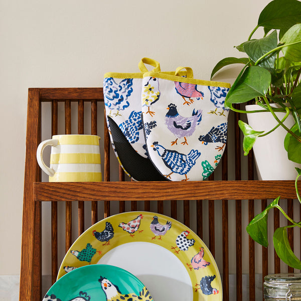 Ulster Weavers' cotton microwave mitts combine practical functionality with distinctive design. These yellow chick-print mitts feature a neoprene-coated interior that delivers reliable heat protection up to 100°C, making them dependable for everyday kitchen use. The durable construction and thoughtful craftsmanship reflect Ulster Weavers' commitment to quality textiles. Measuring 18 x 14.5cm, this pair offers a comfortable fit and reliable grip when handling hot cookware. A stylish addition to any kitchen that balances heritage design with modern performance.
