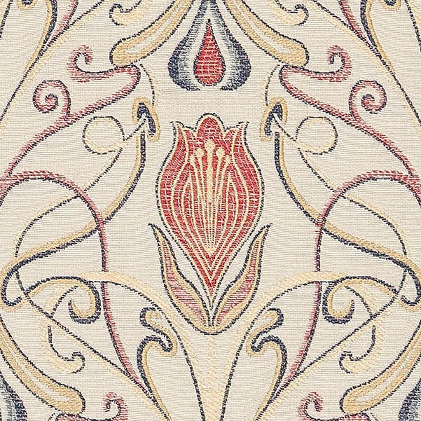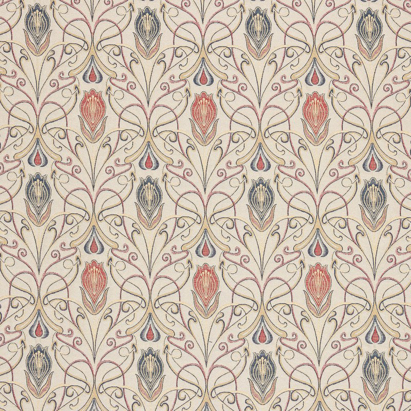 Verona is an art deco style jacquard material which features a beautiful swirling and arching motif that flows around two stylized blooms of colour. This material has a composition of 85% polyester and 15% viscose.