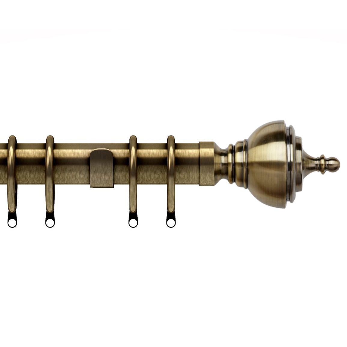 This is the antique brass finish in this curtain pole, which is best described as a brushed brass finish. The finials on this curtain pole are solid metal, and give a very chunky and solid appearance to the curtain pole. The finials with this pole are solid hand made finials, which give a very solid appearance to the pole. These poles are available in Satin Silver and Antique Brass finishes, and are a very stylish curtain pole at very affordable prices.