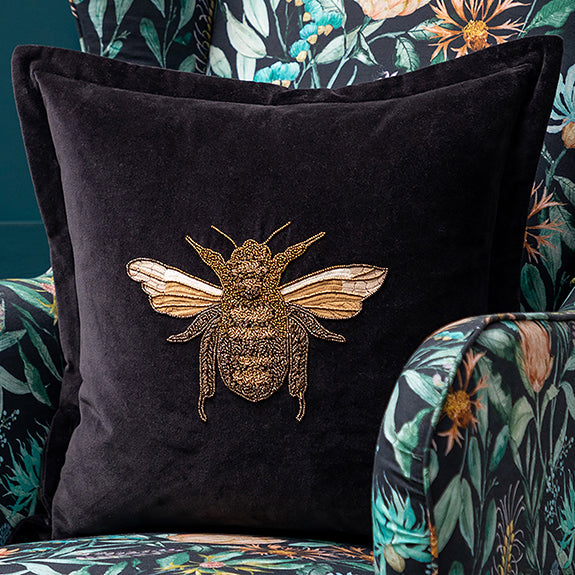 Discover a touch of luxury with the Layla Velvet Cushion from our exclusive iKon collection. Crafted from soft velvet, this cushion combines comfort and style, with a captivating embroidered design and a regal gold embellished bee. The broad Oxford edge adds a sophisticated finishing touch, making this designer cushion a seamless complement to any room. Elevate your home with the impeccable range of designer cushions from Voyage Maison.