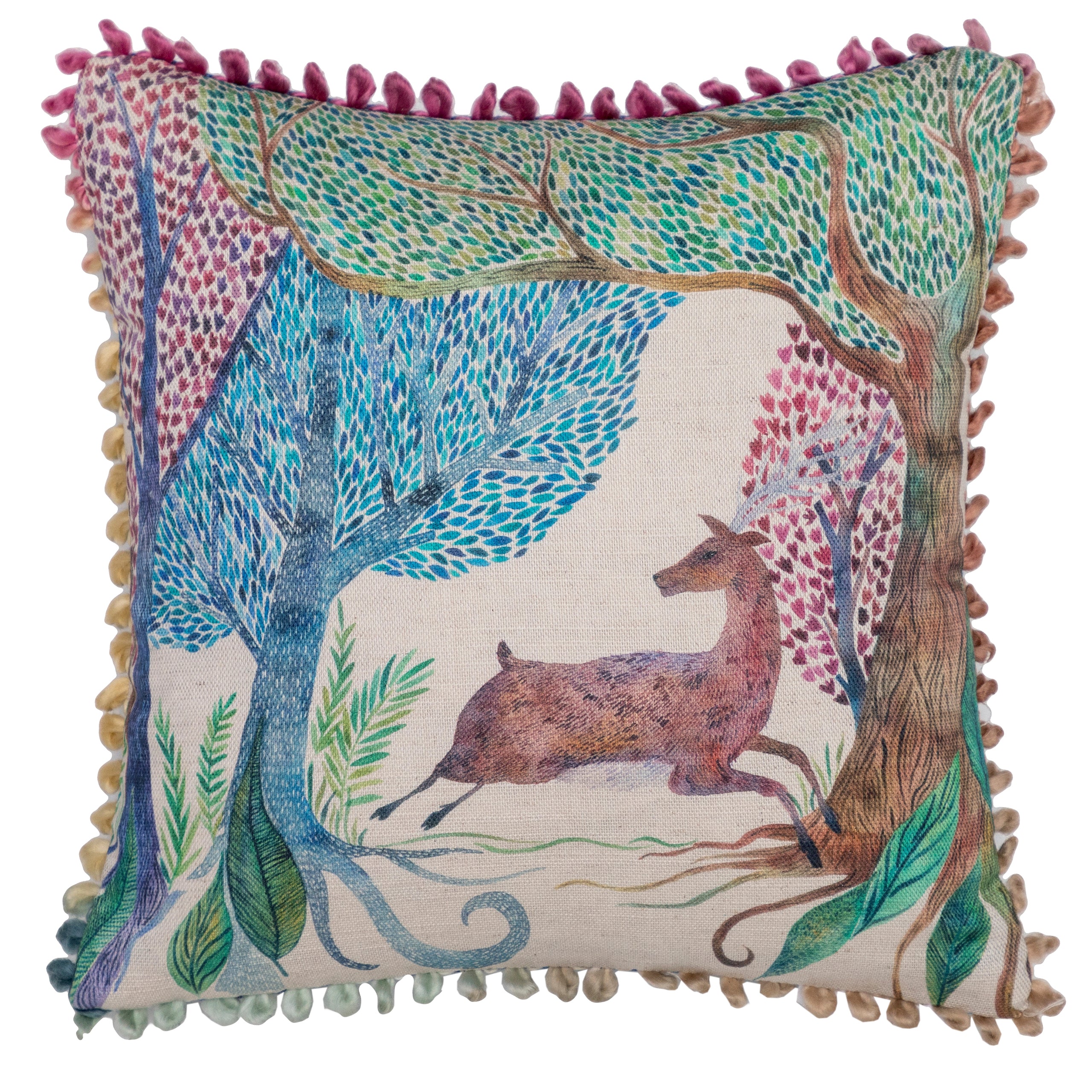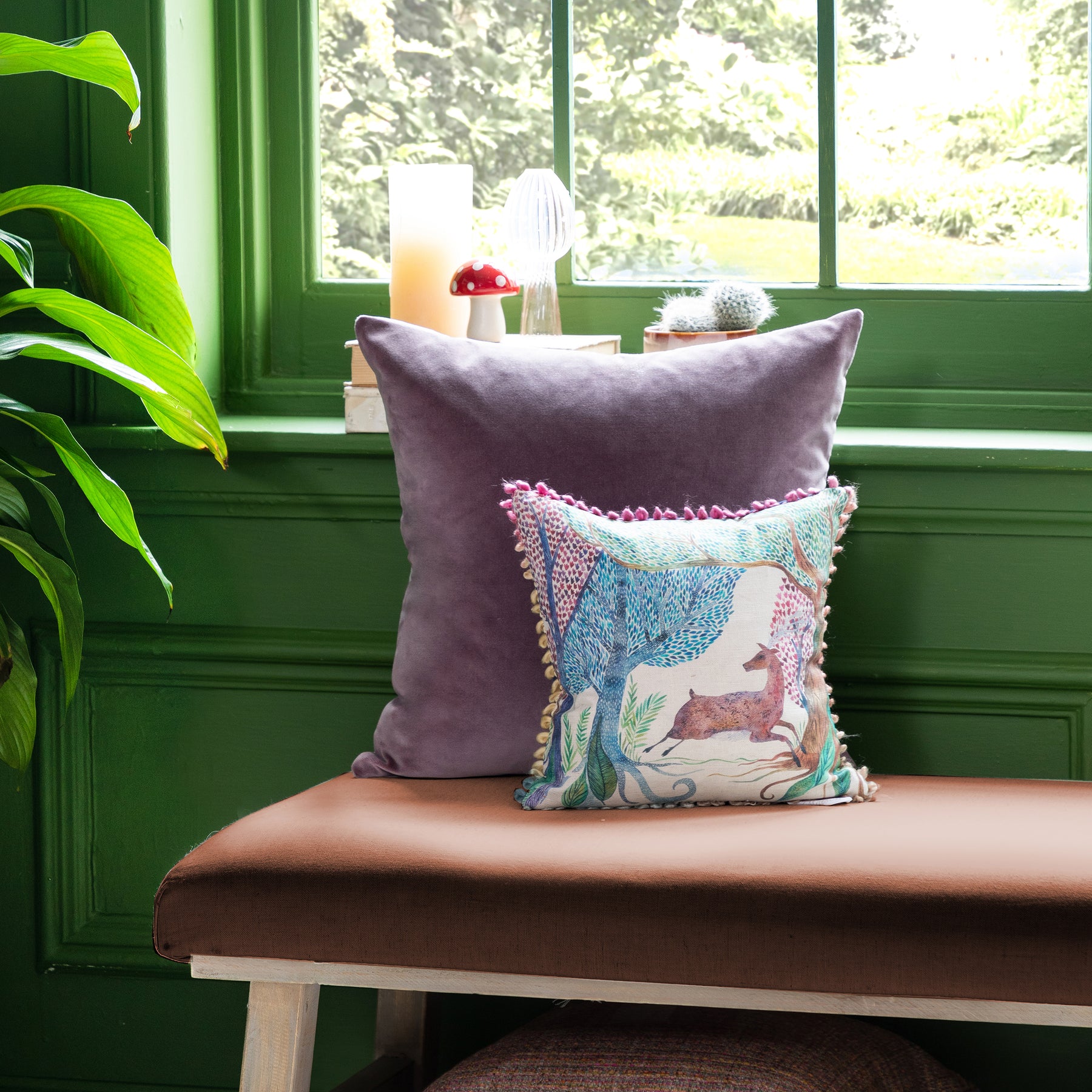 Escape into a whimsical realm with the Willow Woods cushion from the bewitching Woodland Tales collection. Admire the beauty of the woodlands through this linen cushion, featuring an entrancing painted forest scene, trees, and a mysterious deer. Created and fashioned in the UK for quality and opulence, this cushion is printed in-house and filled with sumptuous duck feather. Take home this Voyage Maison designer cushion and allow nature's enchantment to fill your home.