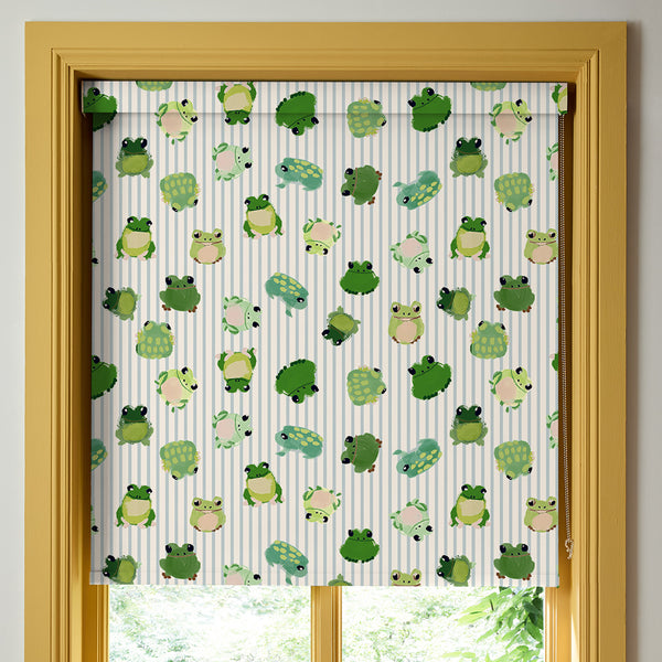 This bespoke light-filtering roller blind is crafted from 100% polyester. Featuring the charming Little Frogs design, it showcases lively, hand-painted frogs in bright greens and yellows. Ideal for young nature enthusiasts, it adds a whimsical touch to any room while gently diffusing light to create a soothing environment for bedtime.