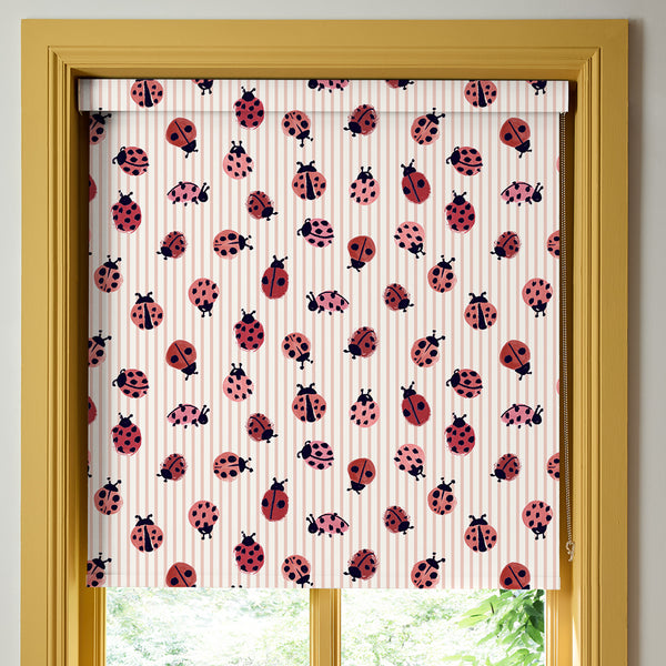 This custom-sized roller blind, crafted from 100% polyester, gently filters light through its fabric. Featuring the Little Ladybirds pattern, inspired by the joy of discovering delicate ladybirds in the garden, this hand-painted design adds a subtle blend of charm, playfulness, and natural beauty to your space.