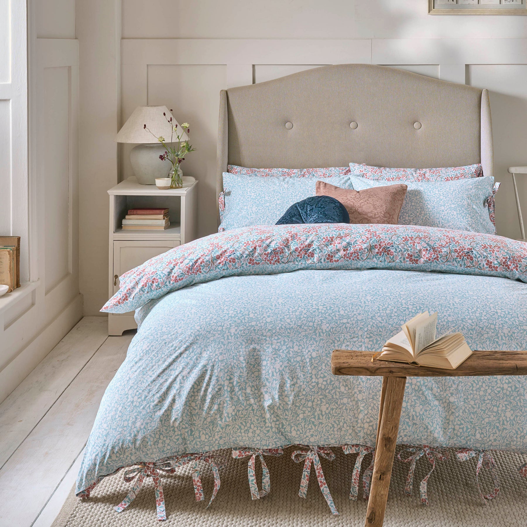 This exquisite pattern showcases a dense arrangement of clover and delicate flowers intertwined with scrolling leaves. Originally created in 1903 by John Henry Dearle, a devoted protégé of William Morris, the design reflects his dedication to his mentor’s artistic vision. Rendered in powder blue and madder hues, this reversible cotton percale bedding set boasts a 200 thread count and elegant tie details on both the duvet cover and pillowcases. Available in single, double, king, and super king sizes, each set includes a duvet cover and two pillowcases (one pillowcase with the single set). Pillowcases can also be purchased separately in pairs.