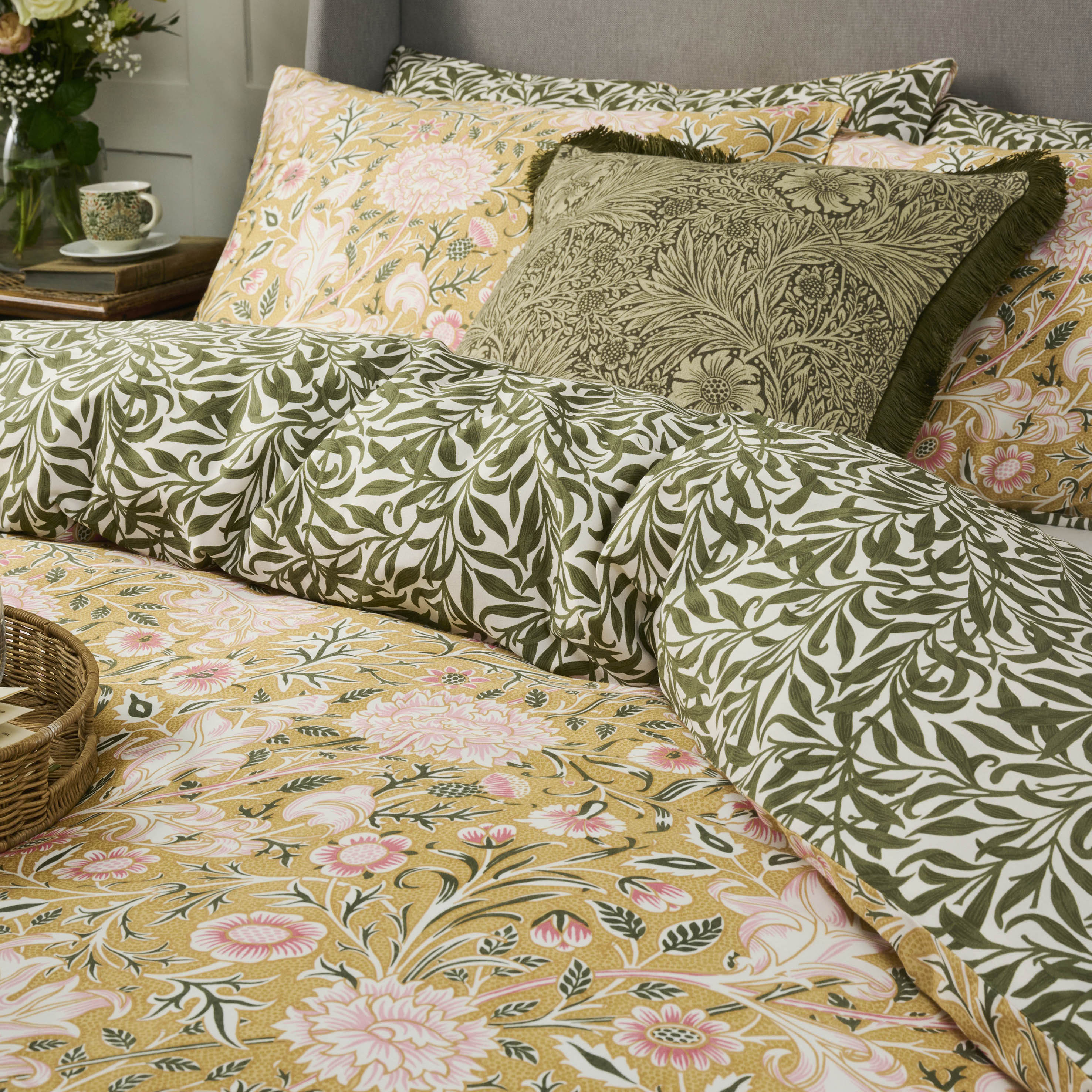 This refined 220 thread count Cotton Sateen bedding features a floral design of pinks, thistles, and chrysanthemums, inspired by the original 1877 Double Bough chintz textile. The pattern is rendered in a rich palette of golden yellows, forest green, and pink, created using natural dyes like sappanwood and pomegranate. The reverse showcases William Morris’ iconic Willow Bough motif in deep forest green. Available in single, double, king, and super king sizes, each set includes a duvet cover and pillowcases (one pillowcase with single sets). Additional pillowcases can be purchased separately in pairs.