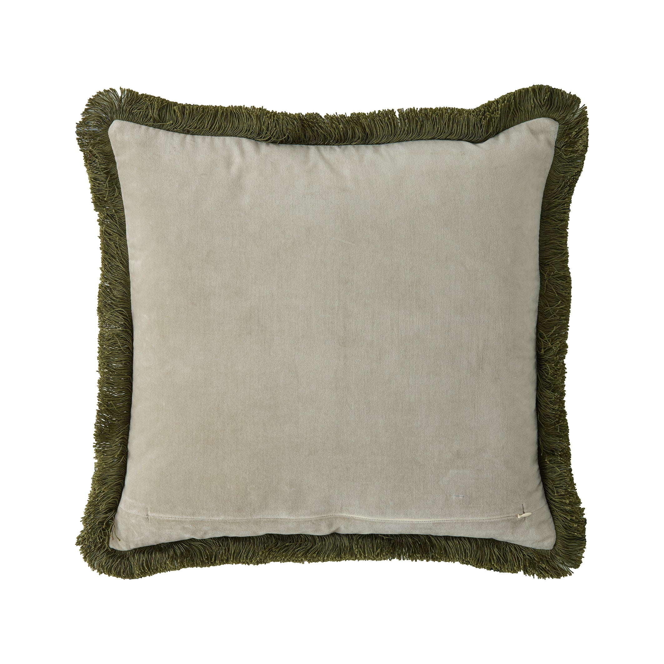 Designed by William Morris and originally registered as a wallpaper pattern in 1875, Marigold showcases large marigold flowers woven with willow-like leaves, set against a detailed backdrop of smaller foliage and blooms. Presented in a deep olive-green colour scheme on a linen-textured cotton fabric, this elegant cushion is complemented by a plain cotton velvet reverse in a soft sage shade.