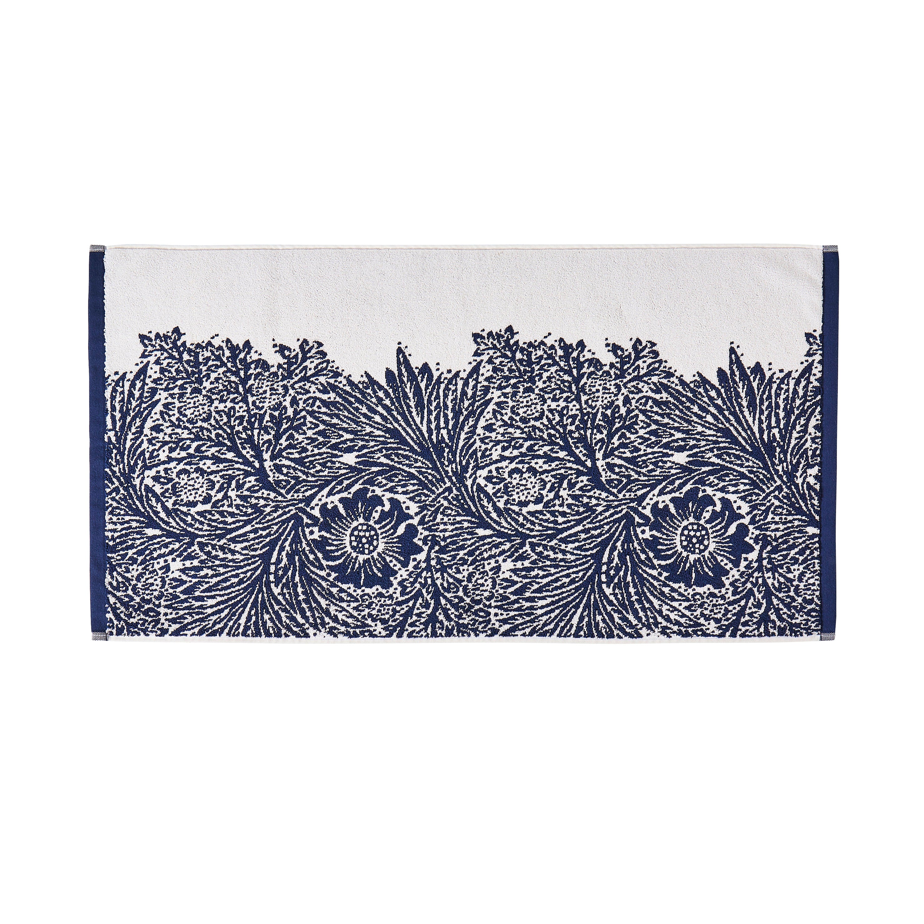 This bath mat features William Morris’s signature Marigold design in deep Prussian blue and crisp cream cotton yarns, creating a luxurious and soft texture. The pattern showcases striking marigold flowers intertwined with willow-inspired leaves, set against a backdrop of delicate foliage. Finished with a coordinating solid border, this mat weighs 950gsm, offering both style and durability for your bathroom.