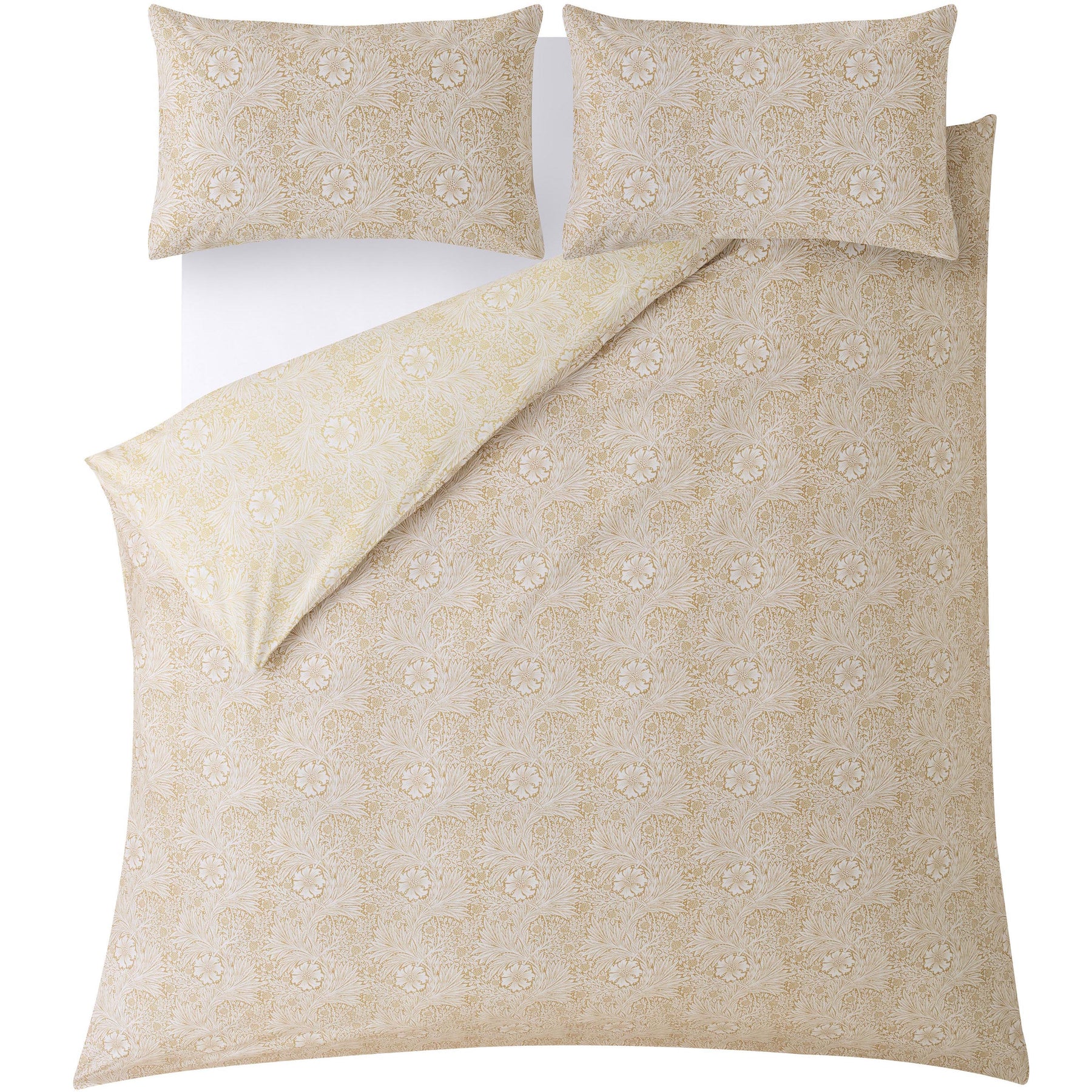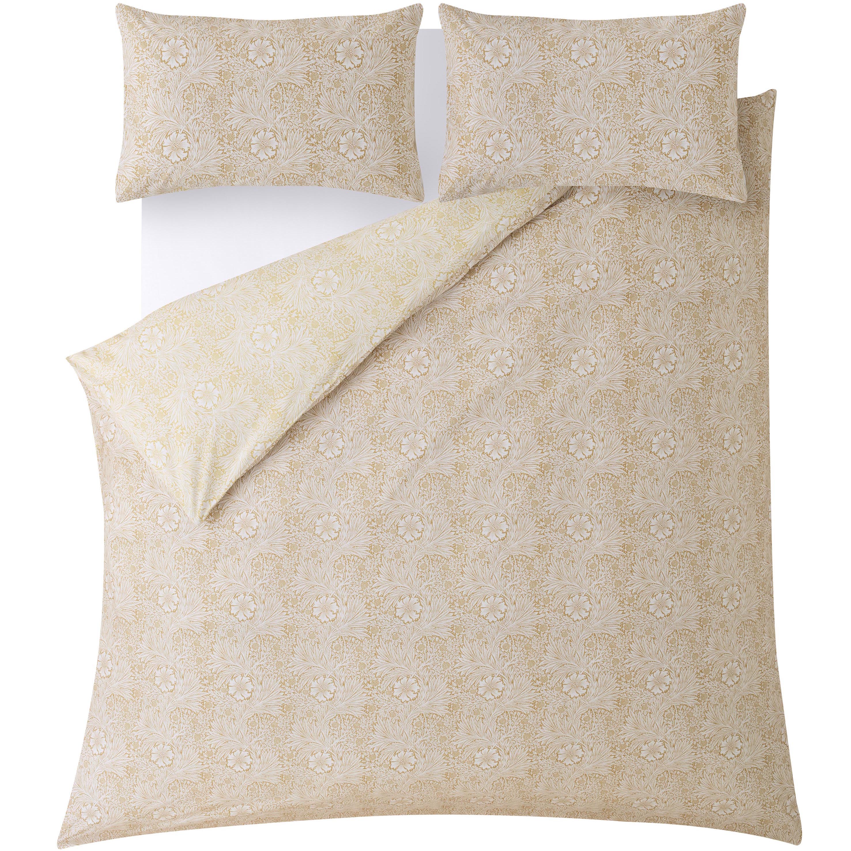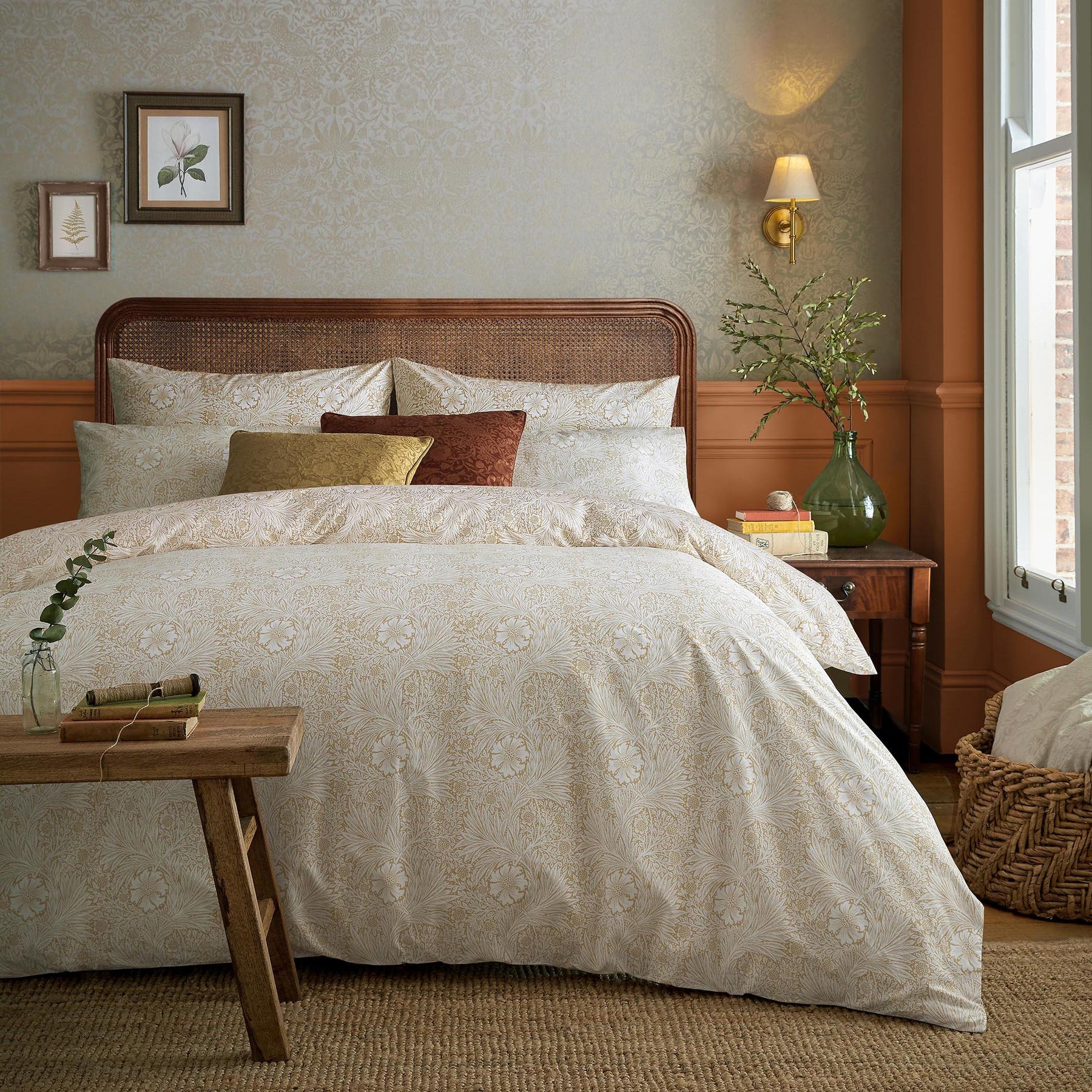 This reversible bedding set showcases striking marigold blooms intertwined with willow-inspired leaves, all set against a backdrop of delicate smaller foliage. The classic William Morris two-tone design is printed on a 200 thread count cotton fabric, featuring a warm honey shade on the front and a complementary natural linen tone on the reverse. Offered in single, double, king, and super king sizes, each set contains a duvet cover and two pillowcases (one pillowcase included with the single set). Additional pillowcases can be purchased separately in pairs.