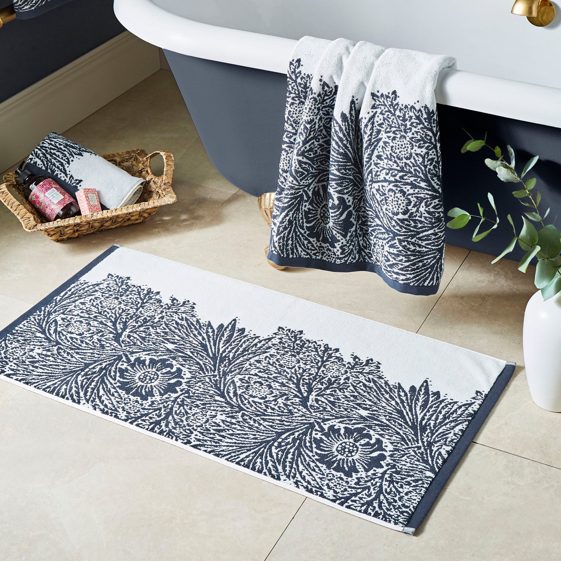 These towels feature a luxurious blend of rich Prussian blue and crisp cream cotton yarns, expertly woven to showcase William Morris’s classic two-tone Marigold design. The pattern highlights striking marigold blossoms intertwined with willow-like leaves, set against a backdrop of delicate smaller foliage. Finished with a coordinating solid border, these towels offer a refined touch and weigh 580gsm for a plush, substantial feel.