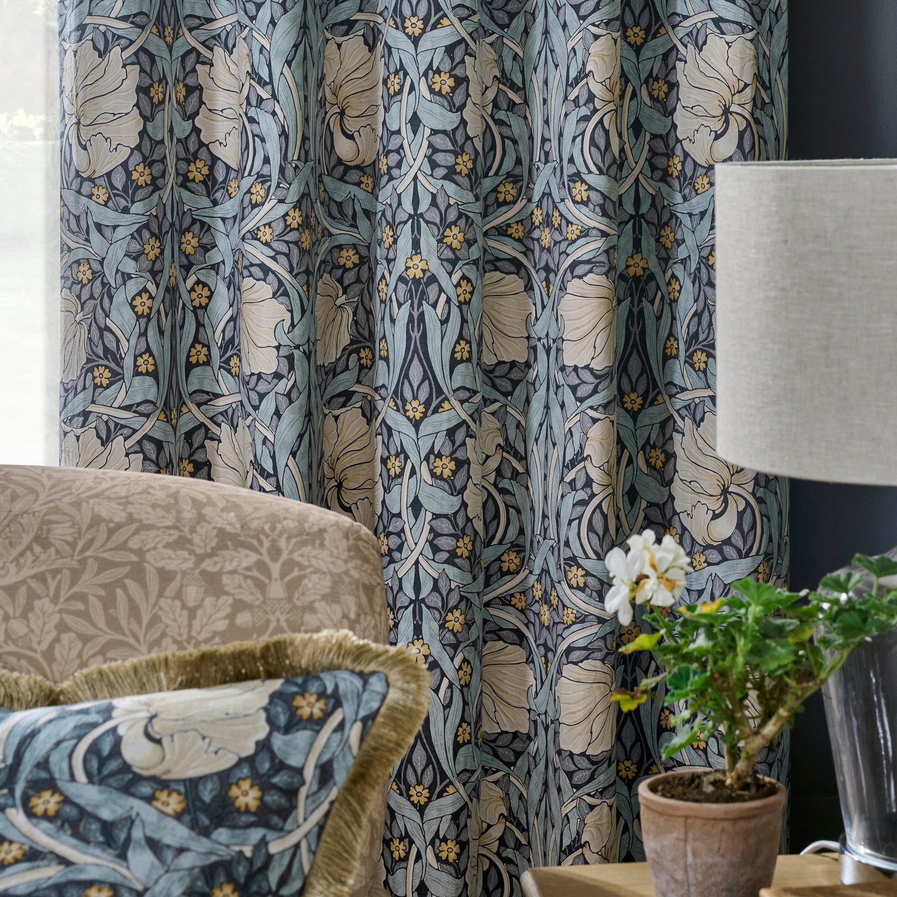 This design, featuring large tulips and curling leaves intertwined with foliage and delicate pimpernel flowers, originates from the William Morris Gallery archive. Originally displayed at Kelmscott Manor, Morris’ summer residence, it is printed on 100% cotton fabric in deep blue hues, warm creams, and bright yellow highlights. Completed with a modern eyelet header and a 50-50 polycotton blackout lining, these curtains bring an elegant and refined atmosphere to any room.