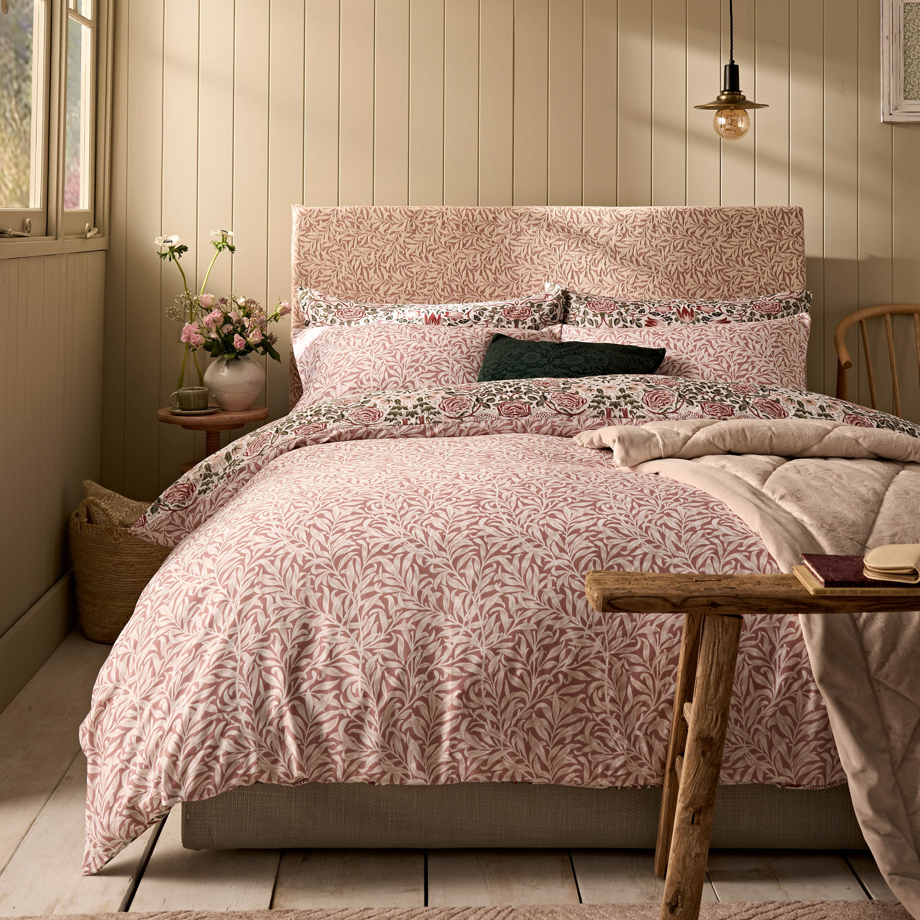 Experience the charm of the William Morris Gallery archive with this exquisite Rose design, originally crafted by William Morris in 1883 as a furnishing fabric. This luxurious 220 thread count cotton sateen bedding showcases detailed tulips, rose blooms, and lively birds in warm clay-pink, terracotta, and sage green hues. The reverse features the classic William Morris Willow Bough pattern in a refined brick pink, lending elegance to any bedroom. Available in single, double, king, and super king sizes, each set contains a duvet cover and pillowcases—one pillowcase with the single set. Pillowcases are also sold separately in pairs.