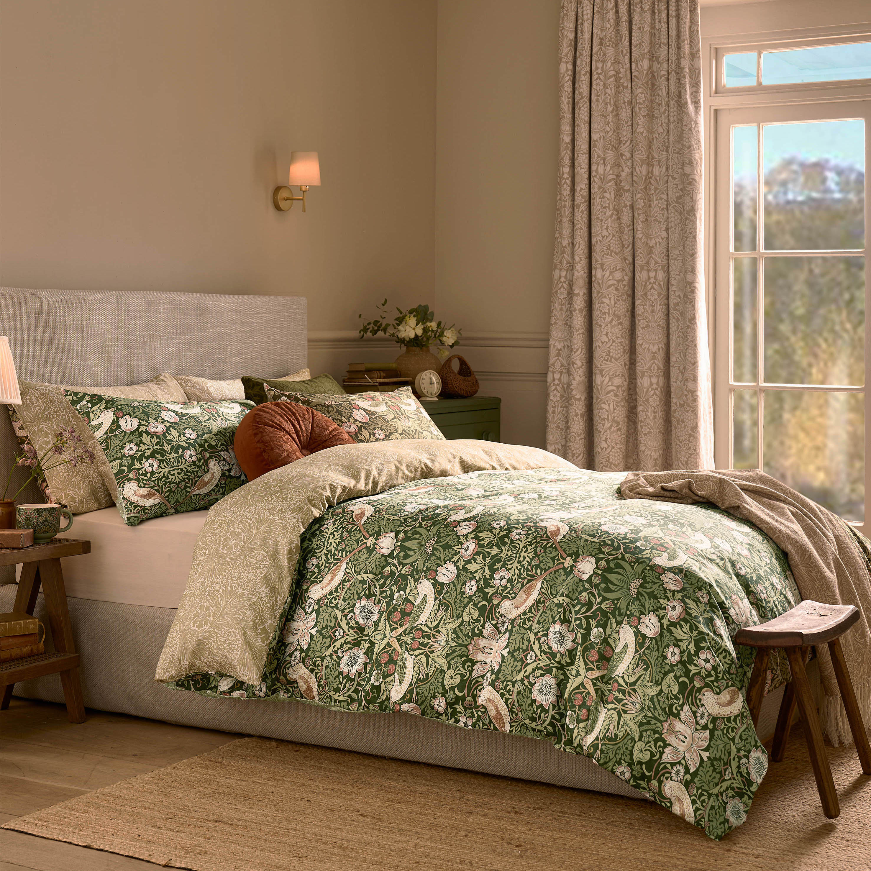 Created in 1883, William Morris’s iconic Strawberry Thief design draws inspiration from the thrushes that visited his garden at Kelmscott Manor in Oxfordshire. This intricate pattern is digitally printed on a soft 220 thread count cotton sateen fabric and features a vibrant palette of lush greens complemented by warm burnt orange and cream tones. The reverse side showcases Morris’s detailed Marigold print in a subtle green shade. Available in single, double, king, and super king sizes, each set includes a duvet cover and two pillowcases (one pillowcase with the single set). Pillowcases are also available separately in pairs.