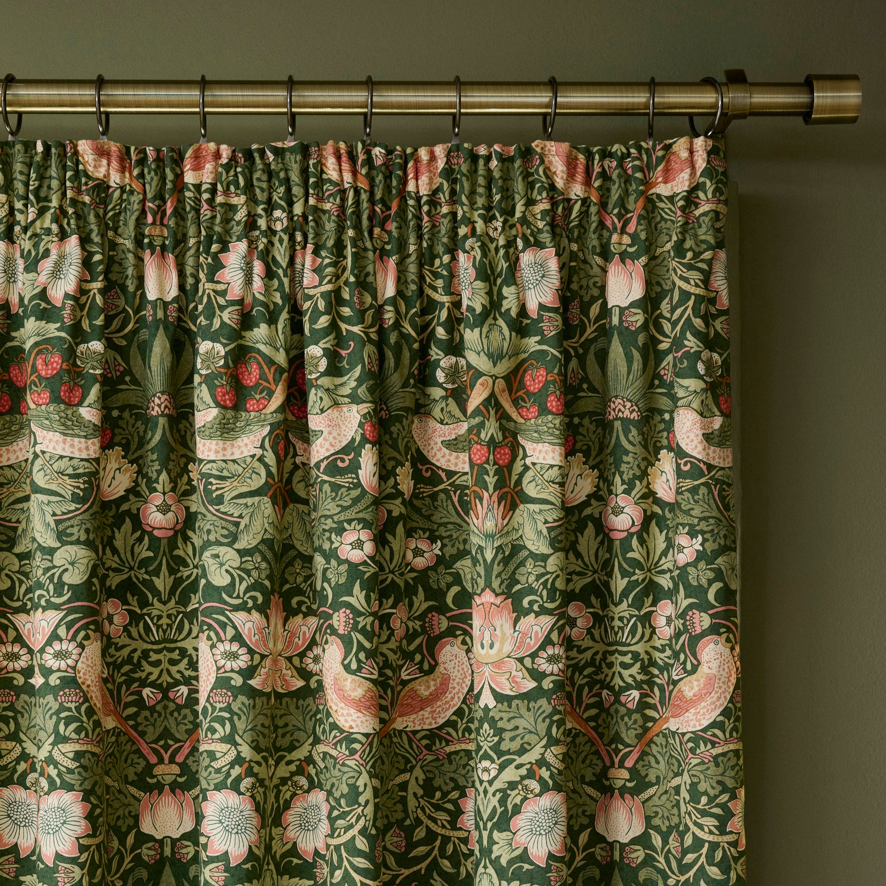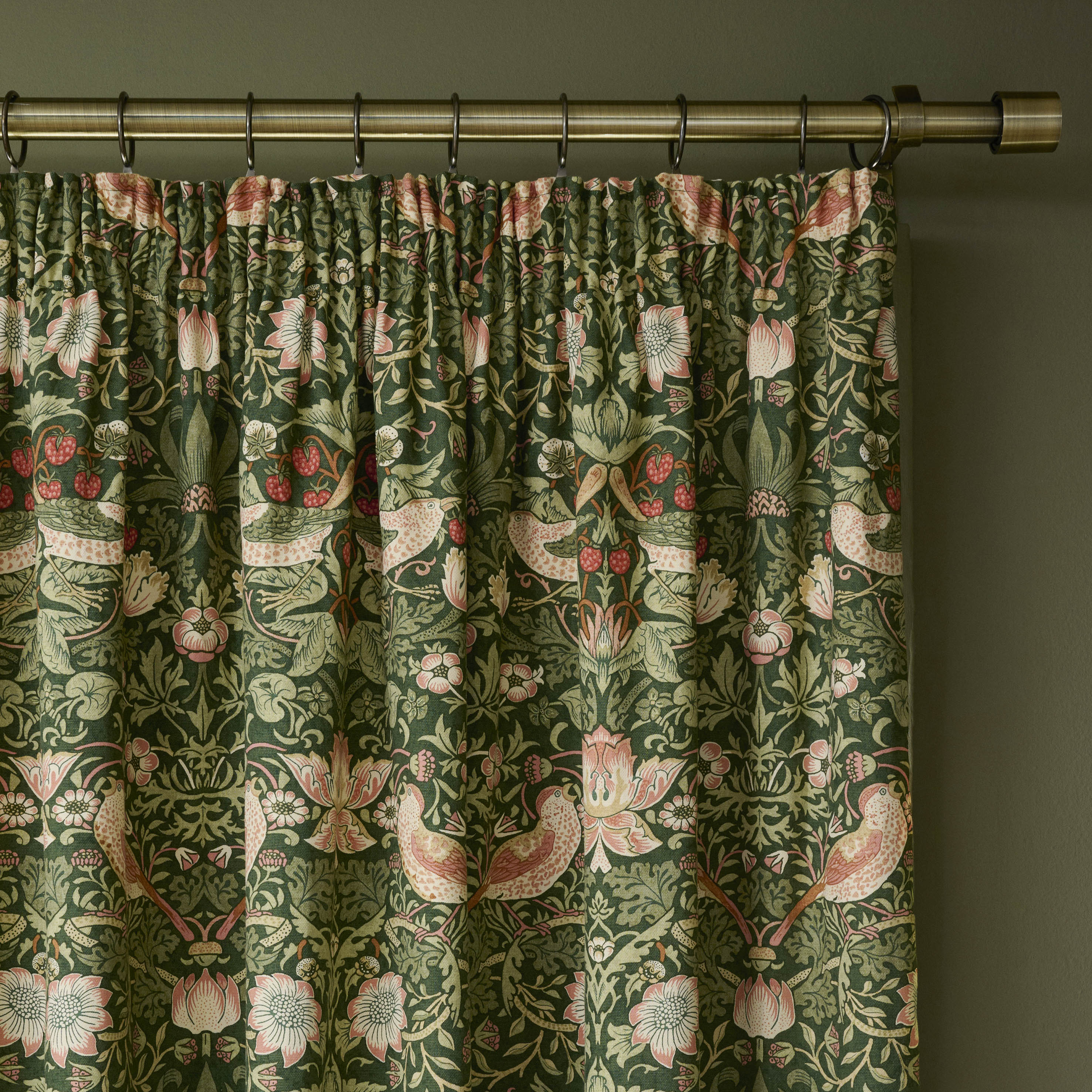 William Morris’ iconic Strawberry Thief design is inspired by the thrushes that would sneak beneath his strawberry nets at Kelmscott Manor. This elegant printed cotton fabric portrays the birds feasting on ripe strawberries. The 100% cotton pencil pleat curtain features a 50-50 polycotton blackout lining, printed in deep greens alongside warm burnt orange and cream hues, enhancing its classic charm and functional versatility.