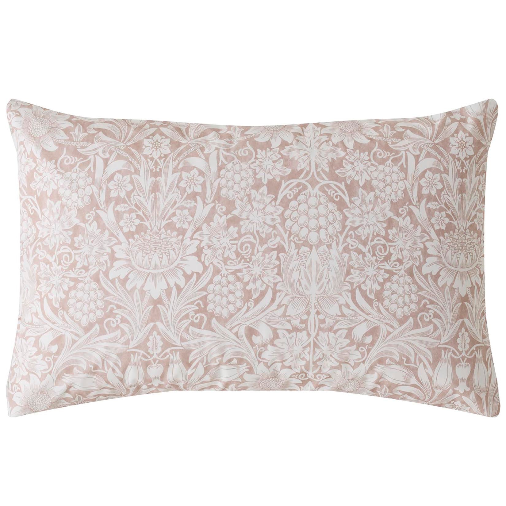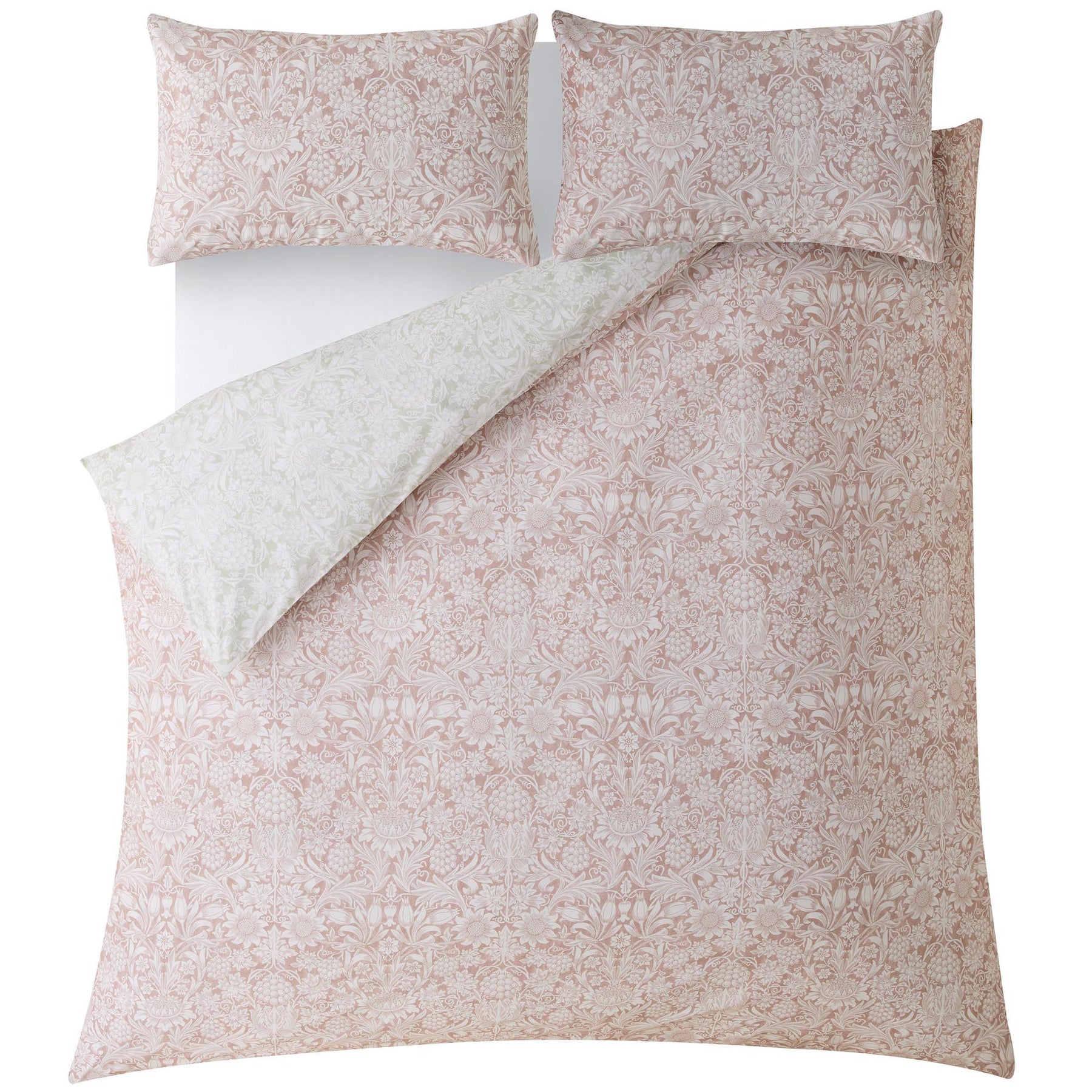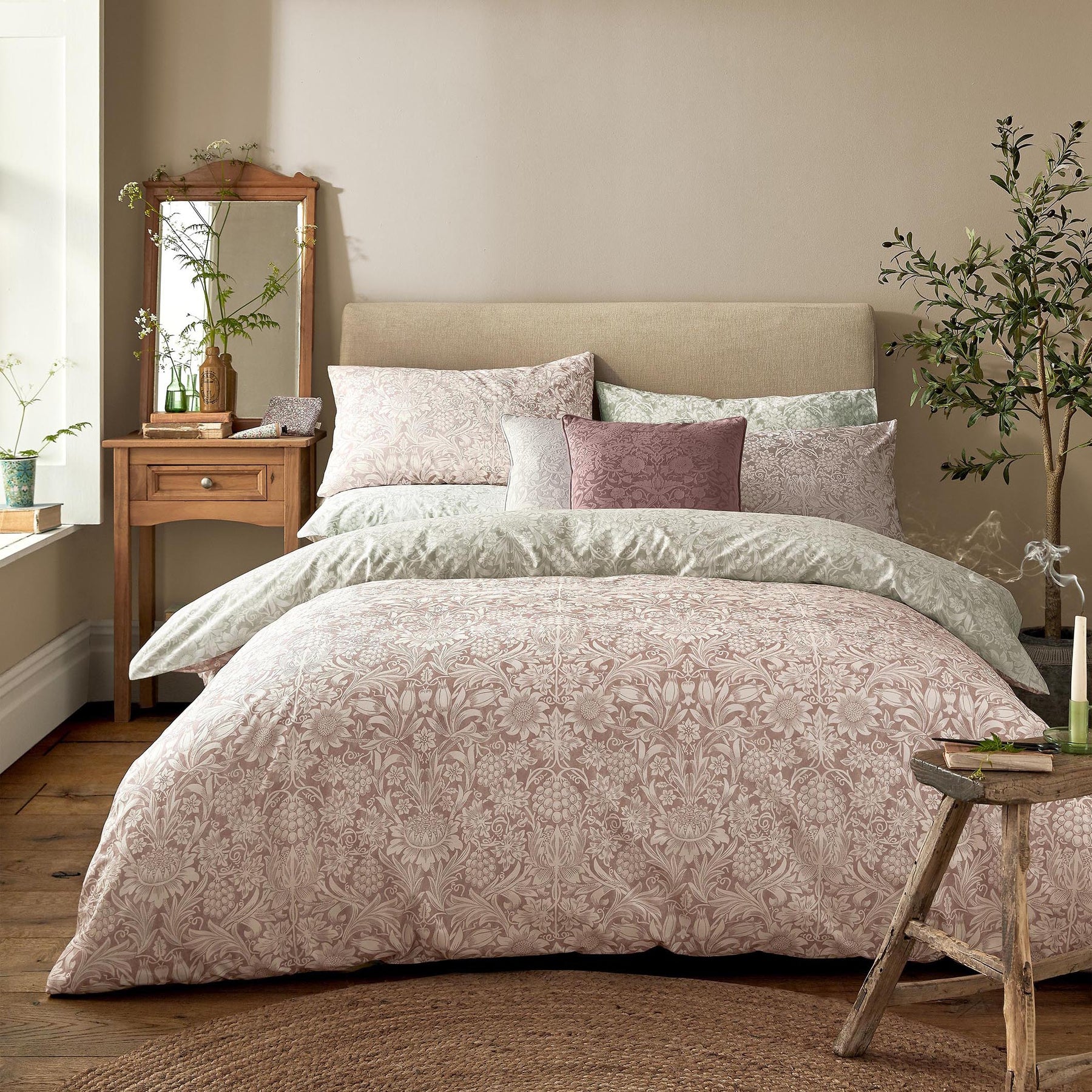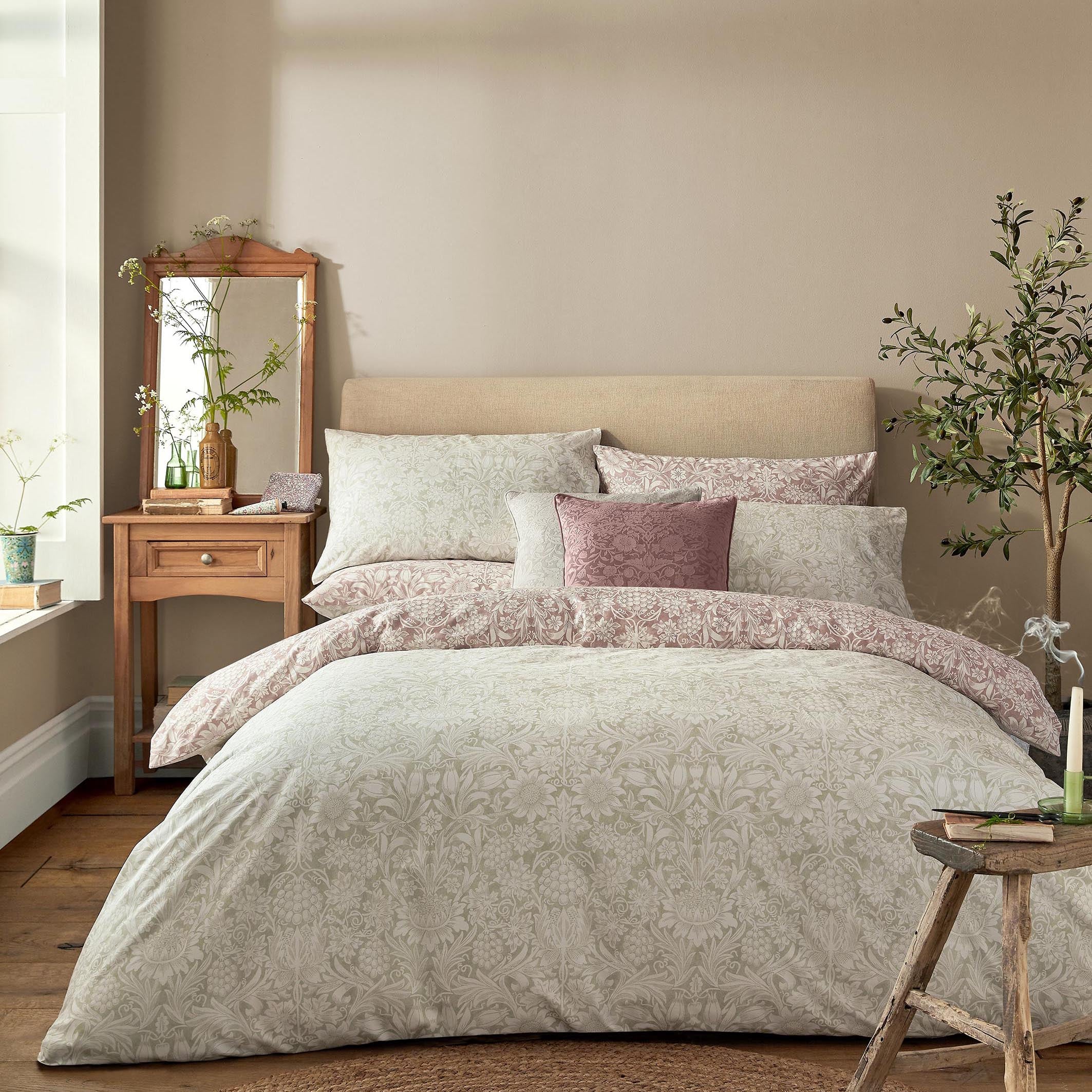 William Morris drew inspiration from his own gardens, incorporating flowers like sunflowers, tulips, and grapevines into his wallpaper designs. This refined, balanced pattern is printed on a 200-thread count cotton fabric. Presented in a tasteful clay pink and gentle leaf green, this reversible bedding offers a modern take on a classic William Morris motif. Available in single, double, king, and super king sizes, each set contains a duvet cover and two pillowcases (one pillowcase with the single set). Additional pillowcases can be purchased separately in sets of two.