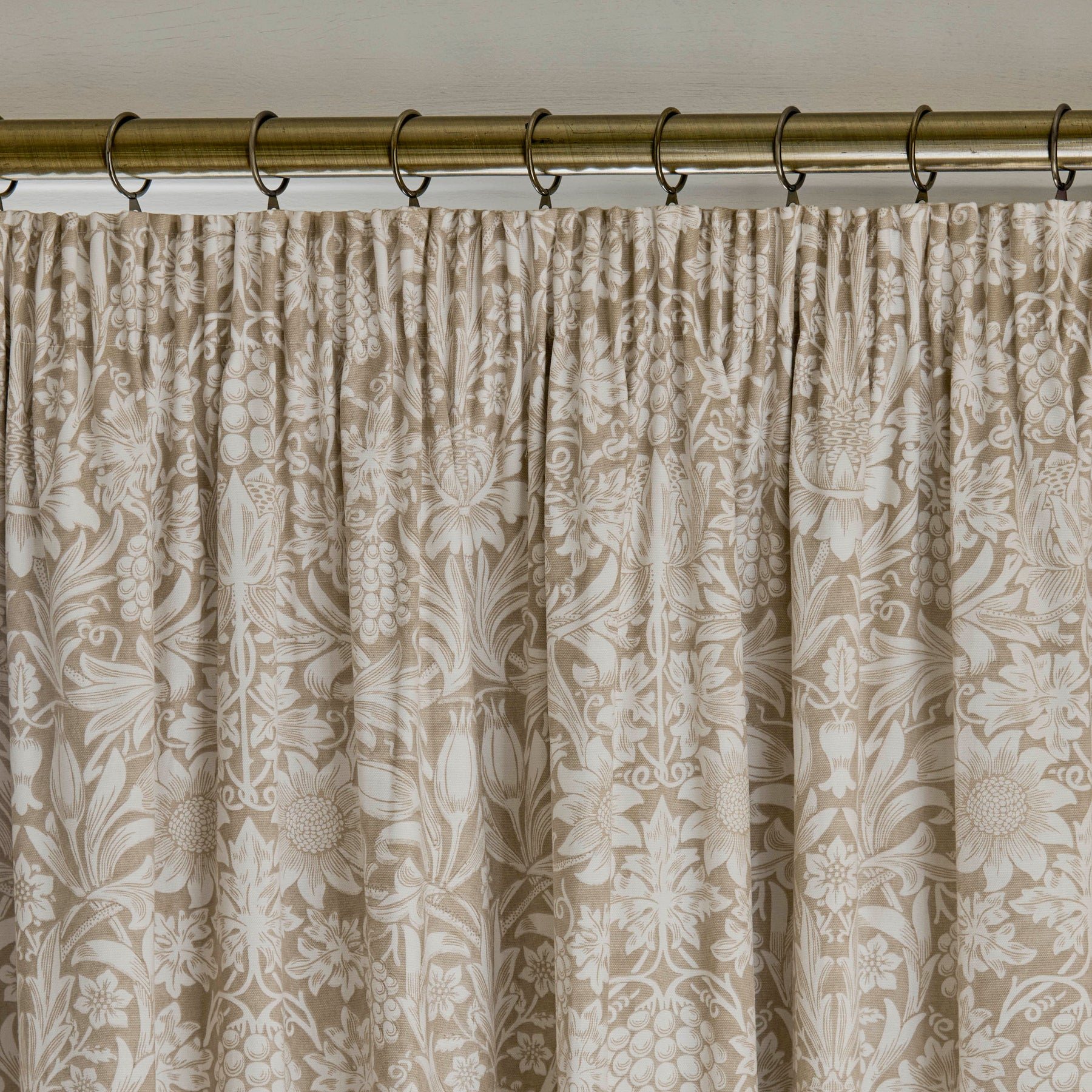 William Morris adorned his Kelmscott Manor garden with the very flowers that inspired his wallpaper designs. This refined, balanced pattern showcases sunflowers, tulips, and grapevines printed on pure cotton fabric. Presented in a modern, warm natural shade, the curtains feature a pencil pleat header and are lined with a 50-50 polycotton blackout material for effective light control.