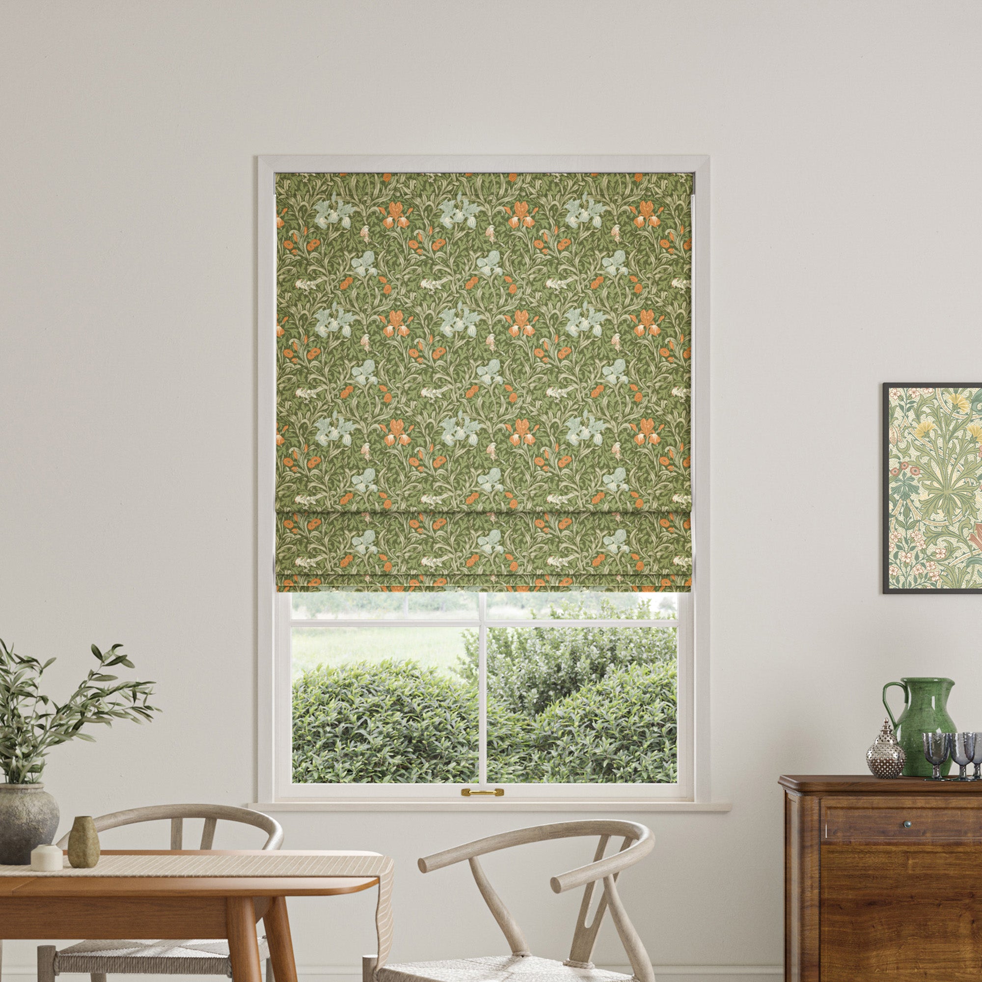 The William Morris Iris Made to Measure Roman Blind in Moss is crafted from 100% cotton, offering a natural and durable fabric choice. This blind features the iconic Iris design from the renowned William Morris collection, celebrated for its timeless botanical patterns and rich heritage. Custom-made to your exact measurements, it ensures a perfect fit for your windows, combining classic style with practical functionality. Ideal for adding a touch of elegance and warmth to any room, this Roman blind balances aesthetic appeal with quality craftsmanship, making it a sophisticated addition to your interior décor.
