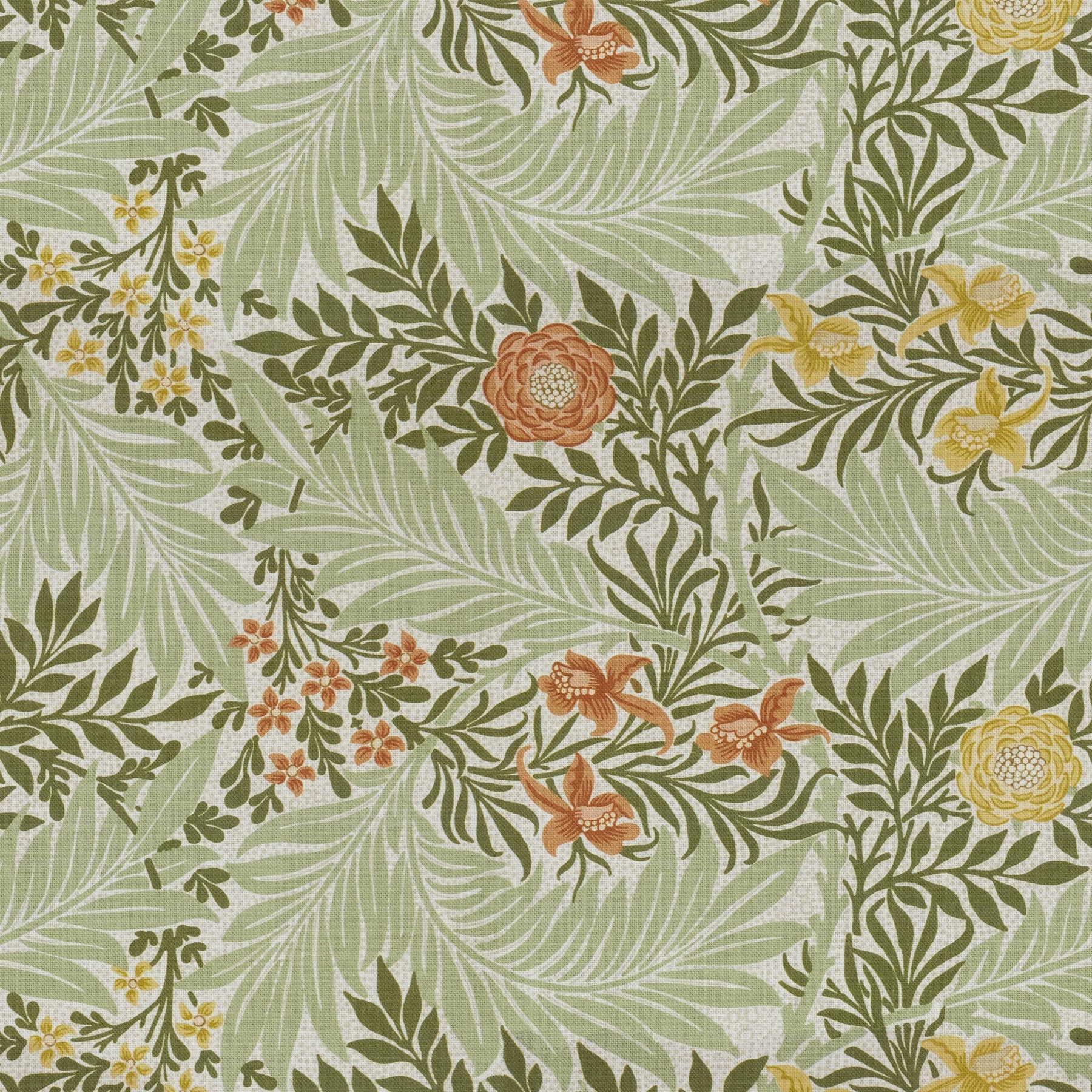 William Morris admired native flowers of the English countryside and grew a variety of roses in the front garden at Kelmscott Manor. Morris’ Larkspur pattern features charming roses, leafy branches, and the distinctively shaped larkspur flowers. Complementing these stylised floral elements, the background is adorned with tiny dots that add a delicate texture to the artwork. This captivating, colourful design has been printed on cotton.