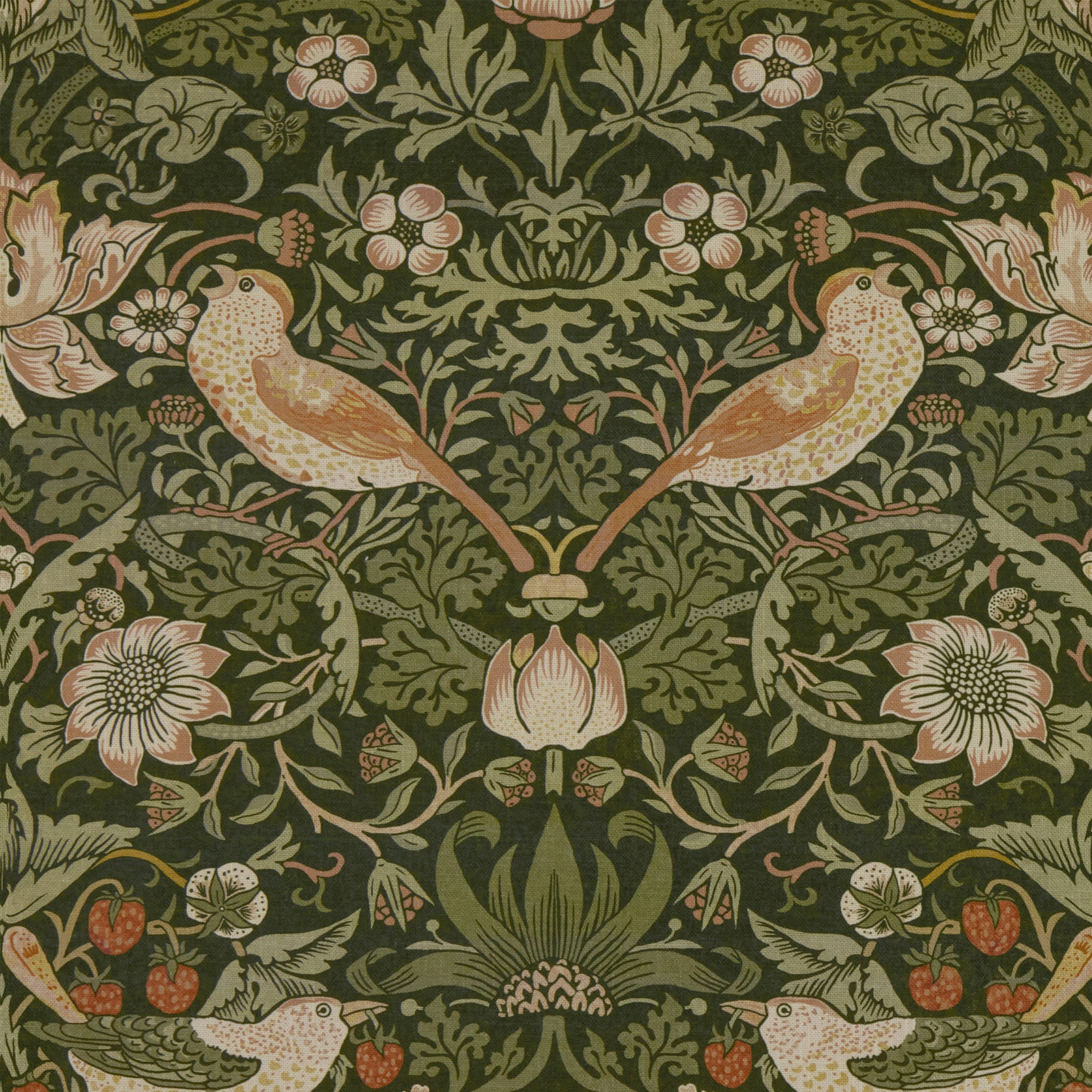 Perhaps William Morris’ most recognisable design, Strawberry Thief, draws inspiration from the thrushes that would sneak beneath the strawberry nets in his Kelmscott Manor garden. The original pattern took several days to print using hand-carved woodblocks to build up the different colours. Designed in 1883, this pattern has been translated and digitally printed onto sumptuous velvet. This design is also available on cotton in a variety of colour combinations, further enriching its versatility and timeless appeal.