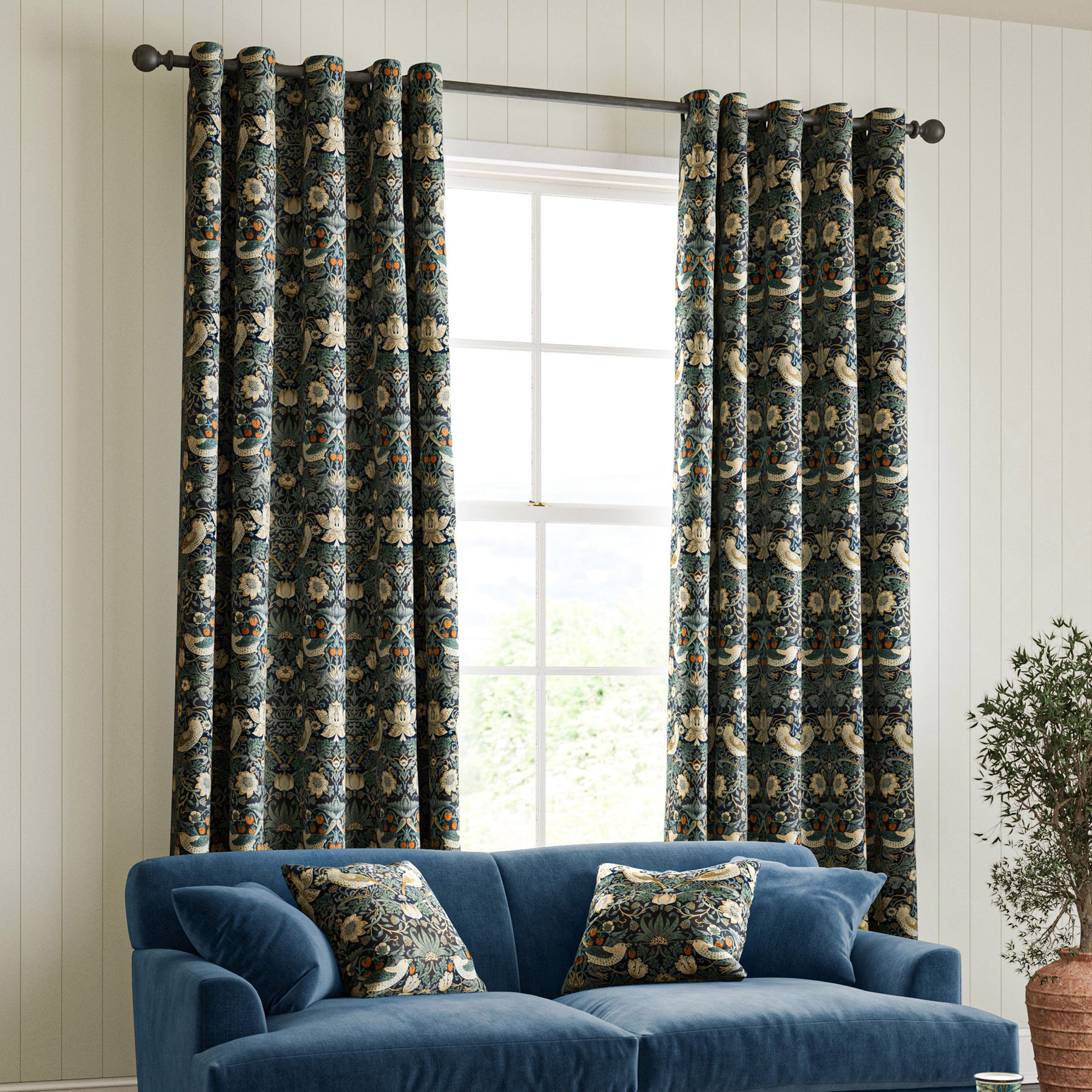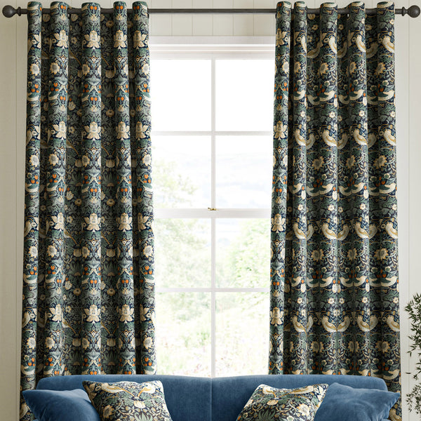 Perhaps William Morris’ most recognisable design, Strawberry Thief, draws inspiration from the thrushes that would sneak beneath the strawberry nets in his Kelmscott Manor garden. The original pattern took several days to print using hand-carved woodblocks to build up the different colours. Designed in 1883, this pattern has been translated and digitally printed onto sumptuous velvet. This design is also available on cotton in a variety of colour combinations, further enriching its versatility and timeless appeal.