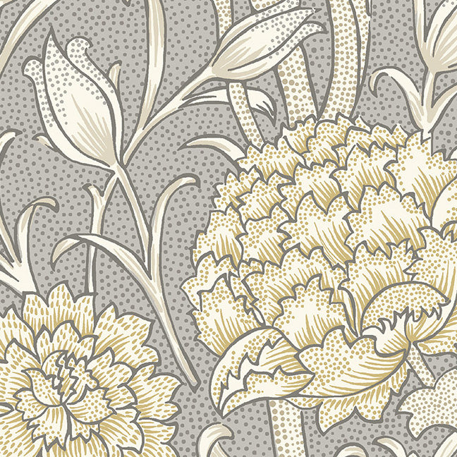 William Morris frequently used tulips in his block-printed fabrics and wallpapers. This design depicts small wild tulips amongst ribbons of larger peonies intertwining with scrolling stems and leaves.