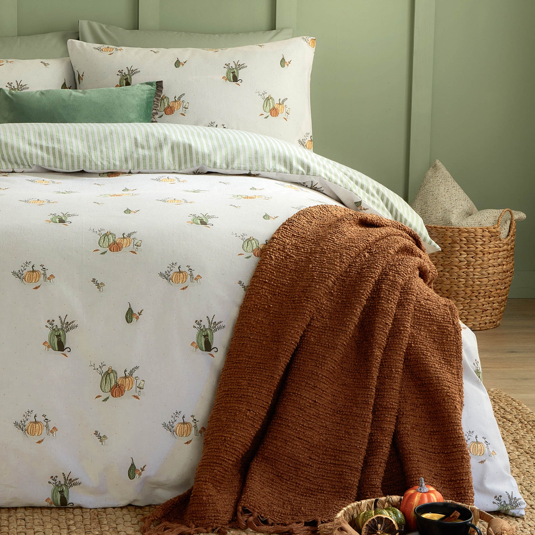 Elevate your bedroom ambiance with the Pumpkin Spice Duvet Cover Set, made from sumptuous brushed cotton. Featuring a delicate seasonal design with hand-drawn motifs, it brings a warm, natural elegance to your space. The reverse showcases a classic stripe pattern, providing a timeless look that suits any season and complements modern country interiors. This duvet set combines refined texture and print artistry with exceptional comfort, making it an ideal choice for cooler evenings and adding subtle seasonal appeal. Made from 100% premium brushed cotton for lasting softness.